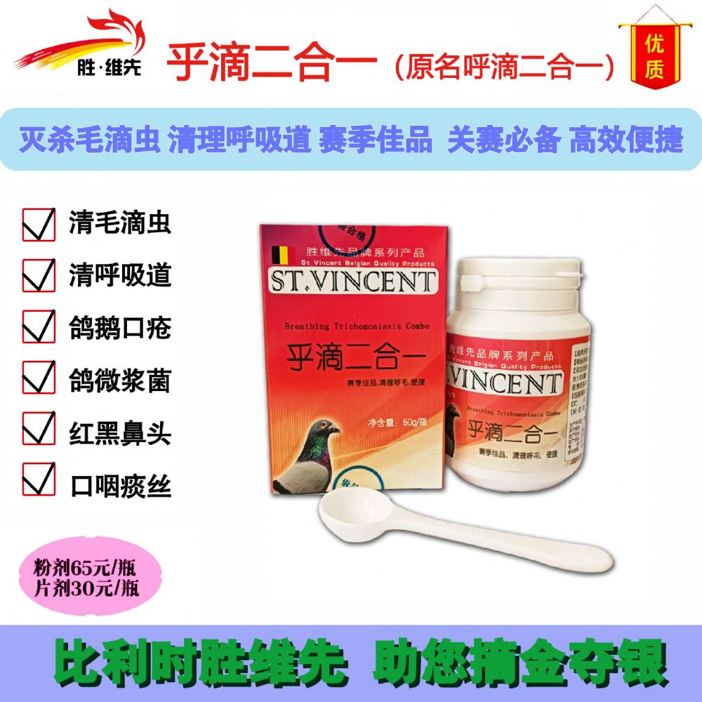 商品名--乎滴二合一 【适用症状】针对信鸽毛滴虫与呼吸道、微浆菌、鹅口疮病菌混合感染症;防治由于毛滴虫、鞭毛虫感染并发或继发的呼吸异声、黑鼻流涎,眼睑肿胀,精神萎靡,张口呼吸等症状。表现为呼吸困难,口内黄色或白色痰丝,喉内针状白点;无精打采、羽毛逆立、闭眼、黄绿色水便、消瘦、飞翔能力下降;口腔、食道及嗉囊内有干酪状黄色结节,吞咽及呼吸困难,使用后肌肉富有弹性、呼吸顺畅、粪便成形好。特别适合赛事密集或多关赛调理。 【用法用量】每1平勺约1.6克,兑水1000毫升(20只鸽子一天的量),预防连用2-3天,治疗3-5天。比赛前或归巢后第二天使用可快速恢复状态,适合多关赛调理。 【规 格】50克/瓶 【贮 藏】密闭、防潮 【生产日期】见喷码 【生产批号】见喷码 【有效期至】见喷码