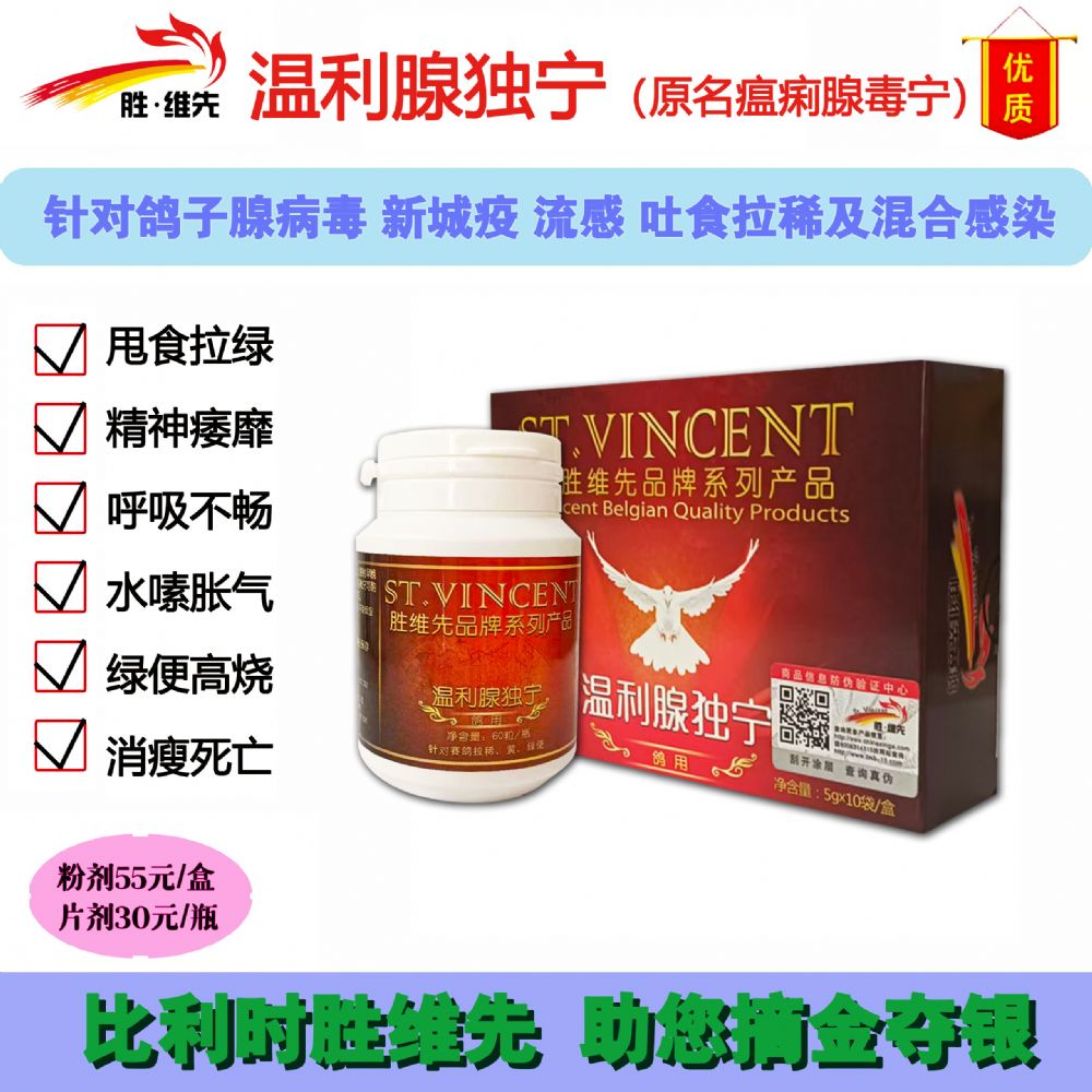 商品名--温利腺独宁 【作用用途】用于腺病毒、沙门氏菌、大肠杆菌等引起的水便、稀便、绿色便、呕吐甩食、呼吸不畅、羽毛松乱、消瘦、粪便颜色异常、摇头歪脖,翅垂跛行、胀嗉、胀水、胀气、消瘦死亡;拉白、黄及绿色水便、黏液便、黑褐色、青绿色条状便等症状。 【用法用量】口服用每包兑水2500-3000ml。预防:连用2-3天,治疗:5-7天,发病初期断食48小时,重症鸽可配合菌痢沙加胜维腺痢康同时使用,不思食水鸽子可早晚各灌服25毫升,连续使用直到恢复。 【规 格】5克×10袋/盒 【贮 藏】密闭、防潮 【生产日期】见喷码 【生产批号】见喷码 【有效期至】见喷码