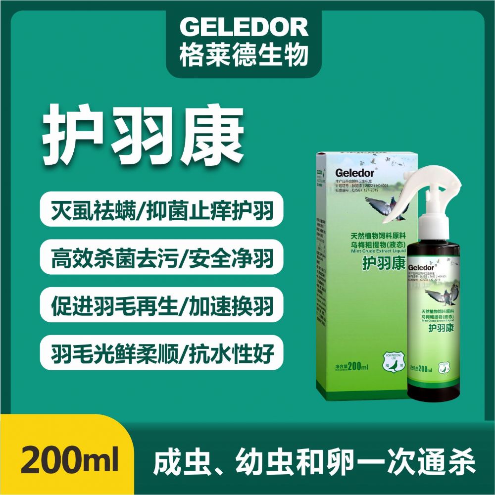 护羽康 净含量:200ml 【功能主治】 广谱驱除体外寄生虫和吸血昆虫,如羽虱、螨虫、蜱虫、鸽虱、恙虫、蚊蝇、血蜘蛛、皮刺螨、锐缘蜱等成虫及幼虫。 抑制虫卵孵化及发育,防止羽毛及脖嗉处细毛脱落,杀虫灭卵。 鸽羽虱、疥螨等引起瘙痒不安,啄羽掉毛、皮肤出血,消瘦、营养不良、羽毛折断等。 改善真菌皮肤病,抑菌止痒促进羽毛再生,加速换羽。 高效去污、安全护羽,洗涤羽毛上的皮屑灰尘,抗水性增强。 【推荐用量】 喷雾:喷雾使用,把赛鸽左右两翅分别伸展拉开后,距离鸽体15cm喷雾,上下各喷1次,严重者可连用3天,日常保健每月使用2-3次,保持赛鸽正常休息。 沐浴:10ml兑水2000ml供自由沐浴,天气晴朗每周1-2次。 驱除蚊蝇:对鸽舍、笼具、巢箱、地 面、墙角定期喷洒使用。