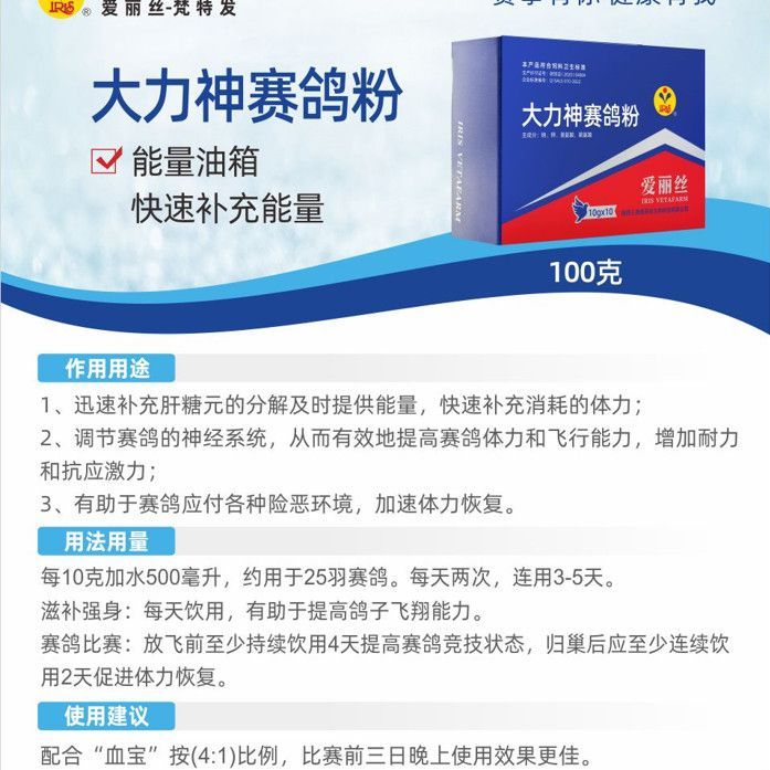 【功效】 1、及时提供能量并补充营养翔速度,有助于迅速提升赛鸽飞速度,增加耐力、抵抗疲劳,排除热紧迫。 2、强心肺、增血氧、补体液,为运动消耗做储存,保证赛鸽爱飞、不喘、不口渴。 3、调节视觉、听觉等神经系统,激发赛鸽潜能积极归巢,顺利应付各种险恶环境。 4、促进新陈代谢,调节体温、含水量和酸碱平衡,维持内环境稳定。强化免疫功能,增加赛鸽竞翔时对各种疾病的抵抗能力。 【用法用量】 每公斤饮水加入本品10克,搅匀,供鸽自由饮用。 赛鸽训飞:每日饮用,有助于提高鸽子飞翔能力。 赛鸽比赛:放飞前至少持续饮用4天.提高赛鸽竞技状态;归巢后应至少连续饮用2天,促进体力恢复:放飞前运输途中应让赛鸽只饮用溶有大力神赛鸽粉的水。 比赛前本品配合血宝使用效果更好。