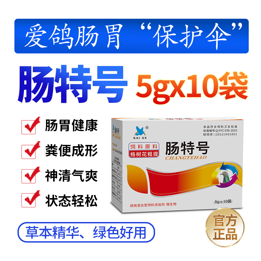 【商品名称】肠道特号 【规格】5g*10袋 【功能】本品是纯中药制剂,调整肠胃、抑毒杀菌、清瘟解毒、涩肠止泻四效合一。在杀灭沙门氏菌、大肠杆菌等病原的同时能迅速平衡机体功能,健胃整肠,调节食欲,防治嗉囊炎,增强免疫抗病力,有效预防耐药性的产生,并且不会影响鸽子体能及健康。种鸽、赛鸽、幼鸽皆可使用。 【用法用量】饮水:每袋泡水1公斤,供30羽鸽饮用。早晚各一次。预防1-3天:治疗3-5天。