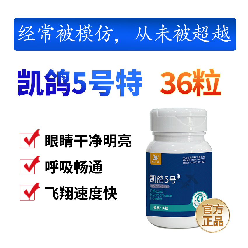 【商品名】凯鸽5号Ⅱ 【规格】36粒/瓶 【主治】衣原体感染 本品是国际公认的防治鸽衣原体病的特效药物,一次见效,三次即可达到治疗目的,不会造成眼砂褪色、羽毛损伤等副作用。 【适 应 症】 1、单眼流泪(有时两侧并发),眼睛红肿,眼角有白色气泡,流水样(后期转为粘稠、脓性)分泌物。 2、口腔粘膜红紫,喉部有粘液。 3、严重的会出现呼吸困难(张口甩头,发出“吱嘎”声)。 4、导致鸽子赛飞能力下降甚至游棚不归。