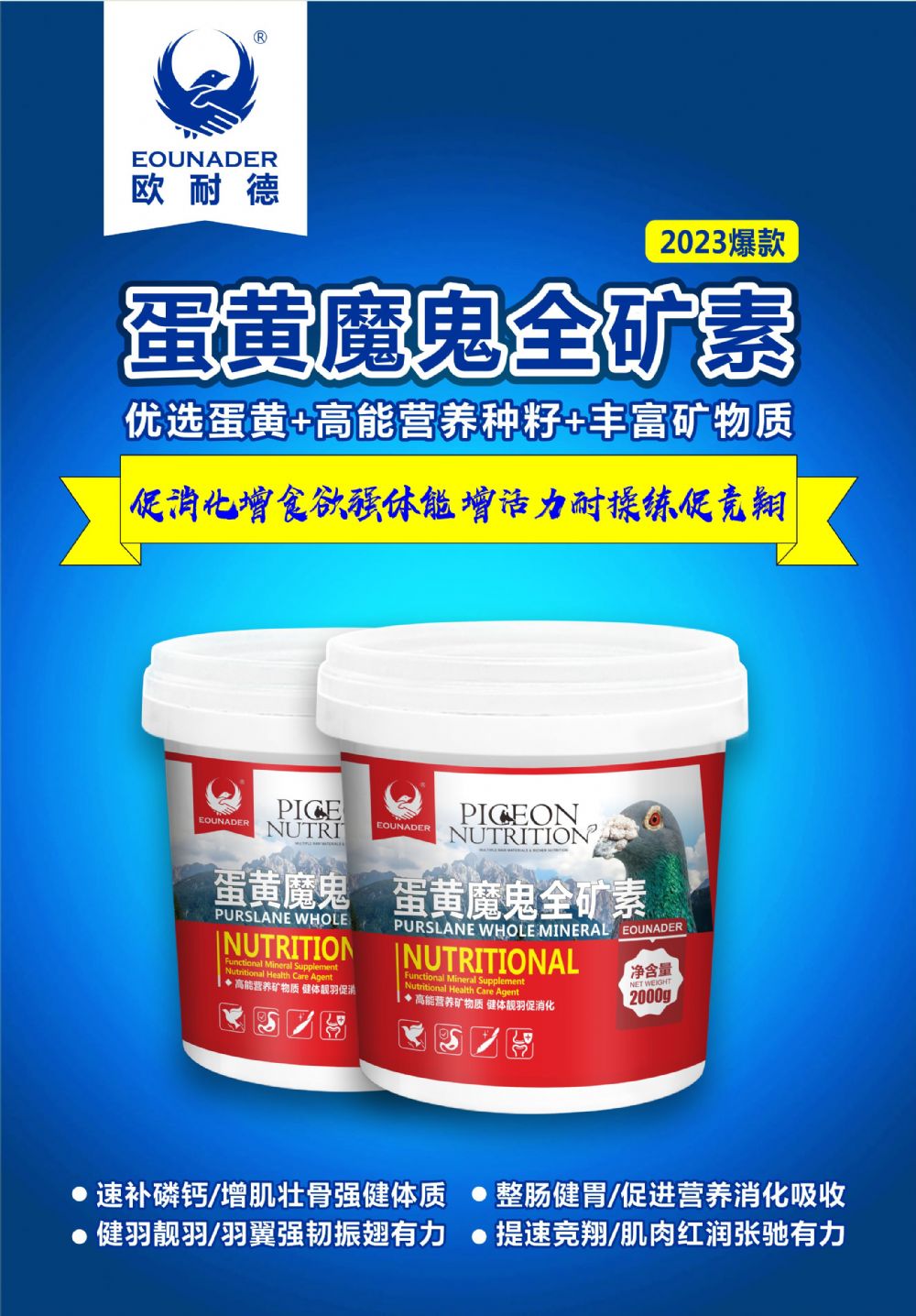 蛋黄魔鬼全矿素 净含量:2000g 高能营养矿物质?健体靓羽促消化 【原料组成】蛋黄颗粒、营养果蔬、滋养丸、红矿石、多维营养土、红啄石、木炭、贝壳、砂砾、麦饭石等。 【使用说明】 【使用说明】 均衡搭配矿物质、多种维生素、氨基酸等,调节鸽体微量元素平衡,强化骨骼肌肉,改善软脚落翅、龙骨弯曲等。 保护胃肠功能,加快肠胃蠕动及新陈代谢,促进营养消化吸收,增进食欲,保持粪便成型漂亮。 强化钙磷吸收,加速换羽增强羽质,羽毛光亮柔顺,减少羽毛断裂开叉,提高防水抗晒功能。 提升种鸽繁殖能力,改善软壳蛋、砂壳蛋、薄壳蛋,分泌充足鸽乳,促进幼鸽生长发育。 【推荐用量】 本品自由啄食,或按15%比例添加到鸽粮中饲喂,全年皆可使用,每日更新,保持新鲜干燥。 幼鸽:生长发育期每周连用2天。 赛鸽:训赛期每周连用3天。 种鸽:配对育雏期每周连用3天。 【贮存】密封、干燥处保存。 【保质期】24个月