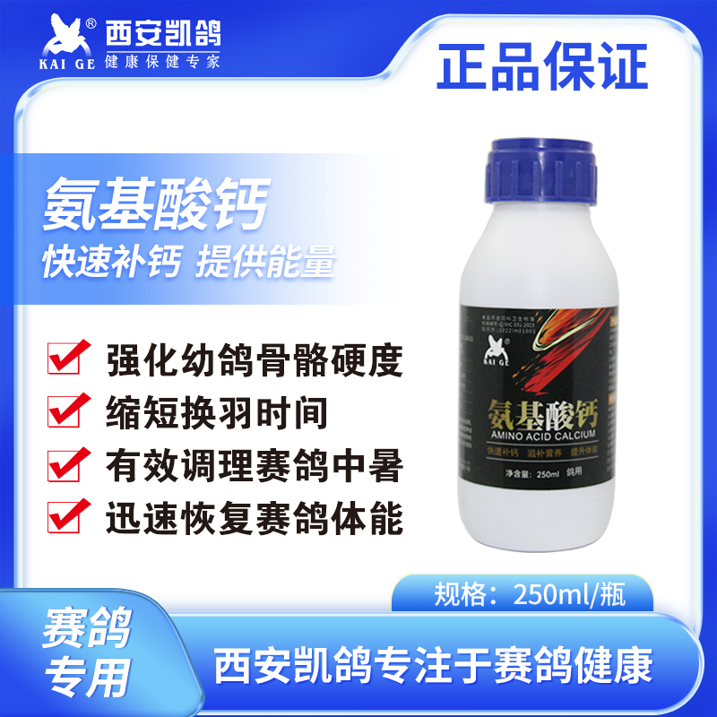 【产品四大优势】 1:纳米级液体,钙含量高,富含多种氨基酸,是普通产品的5~10倍。 2:高吸收率游离钙态,高溶解,高存留,高利用,高吸收。 3:双向调节,吸收好、代谢快。迅速融合多种氨基酸、双歧因子等营养物质,优化肠道内细菌群结构,促进骨骼和大脑神经发育。 4:钙、氨基酸黄金比例合成,是赛鸽骨骼更强壮,提高体能,提升免疫抗病能力。