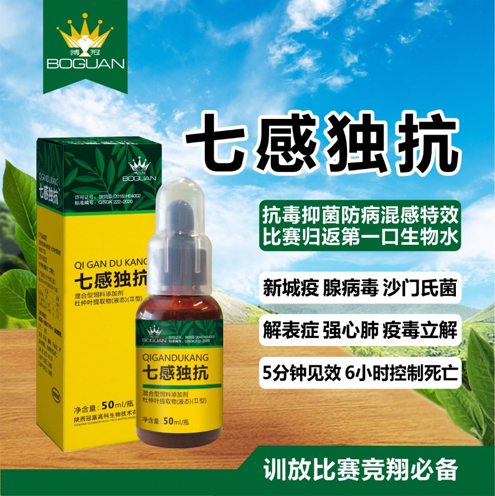 本品为进口胸腺肽、核糖核酸、特异抗体、匹德莫多等精制而成。5分钟内可使机体处于抗病毒、抗病菌状态,能增强鸽子巨噬细胞、自然杀伤(NK)细胞的吞噬功能,促进T细胞增值和CD4+和CD8+T细胞亚群分化成熟,快速提高特异性免疫球蛋白含量,保持鸽子较高抗体水平及红细胞最佳免疫功能。构建鸽子强大的抗病免疫系统,用于鸽瘟(新城疫)、流行性感冒、腺病毒、鸽痘等感染及病毒与嗉囊病、衣原体、沙门氏菌等引起的混合感染及继发感染。 【产品名称】七感毒抗 【主要成分】胸腺肽(Tα1)、特异性免疫核糖核酸(iRNA)、特异性蛋白活性抗体(LIG)、匹德莫多、维生素等。 【性 状】本品为黄褐色或棕红色液体。 【作用与用途】用于鸽新城疫病毒(鸽瘟、Ⅰ型副粘病毒、巴拉米哥)、四季感冒病毒(A型正粘病毒)、腺病毒、痘病毒及衣原体(单眼伤风)、沙门氏菌(副伤寒)、大肠杆菌等混合或继发感染引起的鸽食欲减退,饮水增多,水便、蛋清样或黄白、黄绿稀粪;精神萎顿、体温升高,肿头肿脸、缩颈闭眼、羽毛松乱、两翼下垂、扭头歪颈;胀嗉甩食、呕吐、口流粘液、头爪痘瘤、眼睑肿胀、流泪流涕、张口呼吸、咳嗽喷嚏;不明原因突然发病、死亡等。 【用法与用量】混饮或滴口。 预防 本品每5ml兑水5公斤,一日1次,集中2小时内饮完,连用2天。 治疗 本品5ml兑水2公斤,每天两次,连用1-2天。重症患病鸽可口服原药液0.2-0.3ml。 疾病高发期:每半个月使用1-2天。 新鸽入棚、训赛前、归巢后:使用1-2天,每天1次。 发病期:紧急免疫或治疗,迅速产生抗体,减少死亡。 【临床印证】 1、用于鸽新城疫等病毒性疾病见效比转移因子早1天; 2、免疫空白期补充抗体保护期比免疫球蛋白多2天; 3、和病毒源疫苗同时使用,抗体体效价比免疫高0.3个滴度。 【注意事项】 1、本品可与其他治疗性药物同期配合使用,但不得混合,须间隔6小时使用; 2、久置或冷藏若有少许沉淀析出,使用前摇匀不影响疗效; 3、置于儿童接触不到的地方。 【包装规格】50ml/瓶
