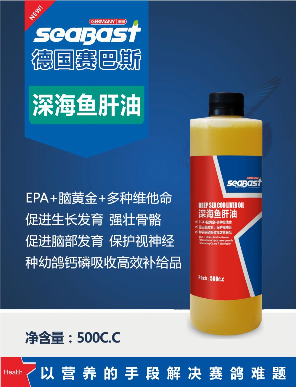 深海鱼肝油 500ml DEEP SEA COD LIVER OIL EPA+脑黄金+多种维他命 促进脑发育、保护视神经 种鸽钙磷吸收高效营养品 本品精选深海鱼油中提取的EPA和DHA,含量高 达50%,全面提高免疫力,清除毒素,抵抗疾病侵袭, 延缓种鸽衰老,活化赛鸽大脑,提高辨向力,促进血 液循环,增强爆发力和耐力,是专为种鸽繁殖、幼鸽 发育、赛鸽训飞研发的生物科技营养补品。 【主要成分】 EPA、DHA、深海鱼油提取精华、VA、VD3、VE、促生长因子、Ω-3脂肪酸、甘油、嗜热链球菌、微量元素等。 【产品功能】 活化脑细胞,高效促进脑部发育,保护和改善视神经。 强肝解毒,清除血管中的杂质和毒素,增强抗病能力和抗应激能力。 补充营养,提供能量,提高机体免疫力、辨向能力和记忆力,增加归巢率。 促进钙磷吸收,加速骨骼肌肉的生长,强壮体质,提高免疫力,抵抗疾病侵袭。 预防激烈竟翔后,腿软虚脱,两翼下垂的现象,快速恢复体力,增强耐力。 保护肠道粘膜,加速病后组织粘膜的修复、形成和再生,促进机体康复,提高抗病力。 抗热止渴,耐翔不易喘,促进羽毛柔软靓丽,肌肉结实有弹性,红润饱满,鼻头粉白。 【推荐用量】 本品10c.c拌1kg微湿饲料。日常保健,连用1-2天。 育雏期:每周连用2-3天,骨骼坚硬,肌肉红润。 训赛期:每周连用3天,提升携氧量,达巅峰状态。 配对前两周:每周连用3-5天,防软壳蛋、糙皮蛋、种鸽虚脱现象。 家飞及归巢后:连用2-3天,改善抽筋落翅、舌尖变紫现象。 【储 藏】密封,阴凉处保存。 【保 质 期】3年 【执行标准】Q/XHV 003-2016 【生产日期】见喷码