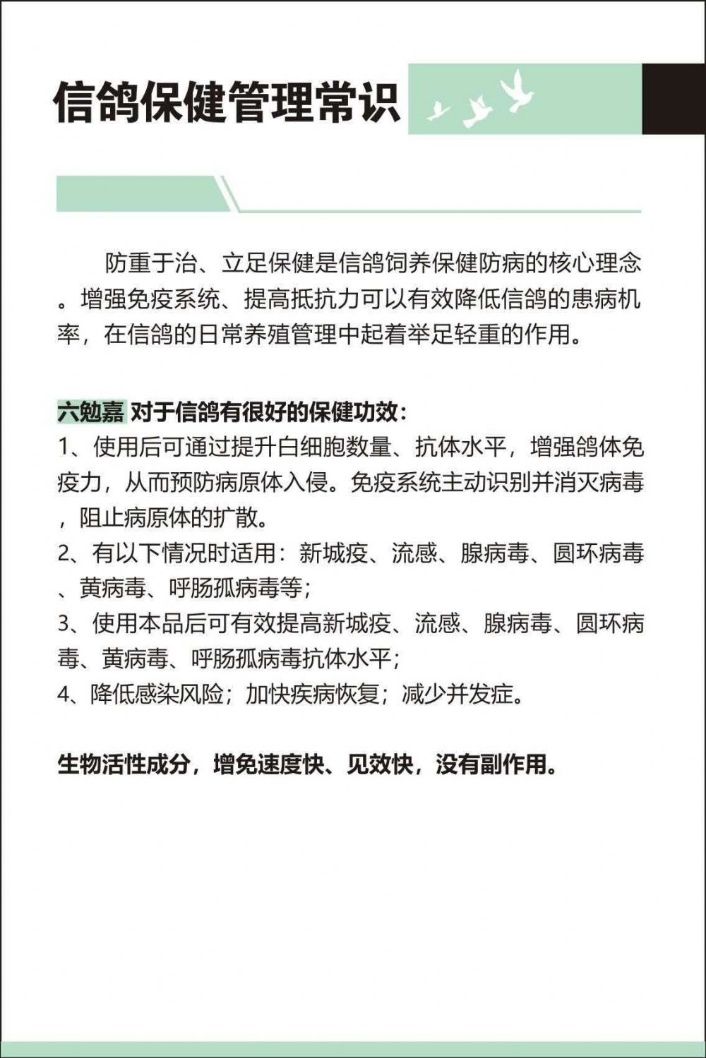 增强赛鸽免疫力,补充抗体,饮水补充 2.针对圆环病毒,轮状病毒,新城疫,流感,腺病毒,黄病毒,呼肠孤等多种比病毒的防治 3.收鸽期(长途运输,天气多变,环境因素,导致抗应激能力较差) 入棚观察期(小鸽子体质弱,黄,白,绿粪便,导致疫苗注射时间滞缓) 疫苗期(疫苗后赛鸽吸收水平不均,出现特殊情况,可饮水补充抗体,促进吸收,代谢) 混群期(体质不同,易生病,出现交差感染),家飞期,训放期,比赛期,种鸽期,育雏期,疾病防控或者疾病爆发时均可使用。