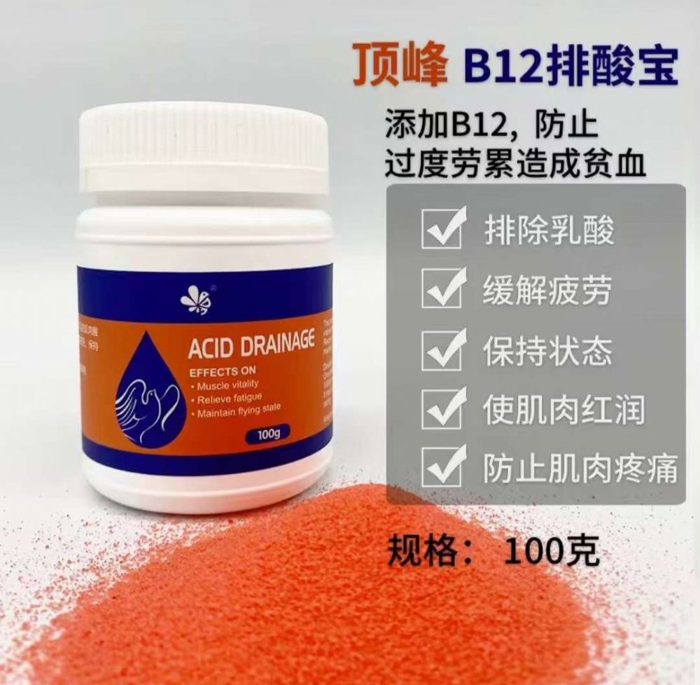 顶峰VB12排酸宝,排除毒素,防止乳酸堆积造成肌肉酸痛,缓解疲劳,防止信鸽由于剧烈飞行造成的贫血,保持信鸽的平衡感,每瓶100克