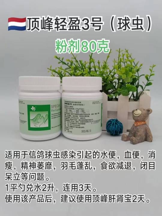 顶峰球虫净,本品针对鸽友赛期需求,特研制出对赛鸽肝脏和肾脏不造成任何损伤,不影响飞行状态,且能提高免疫力的新型纯中药治疗剂。