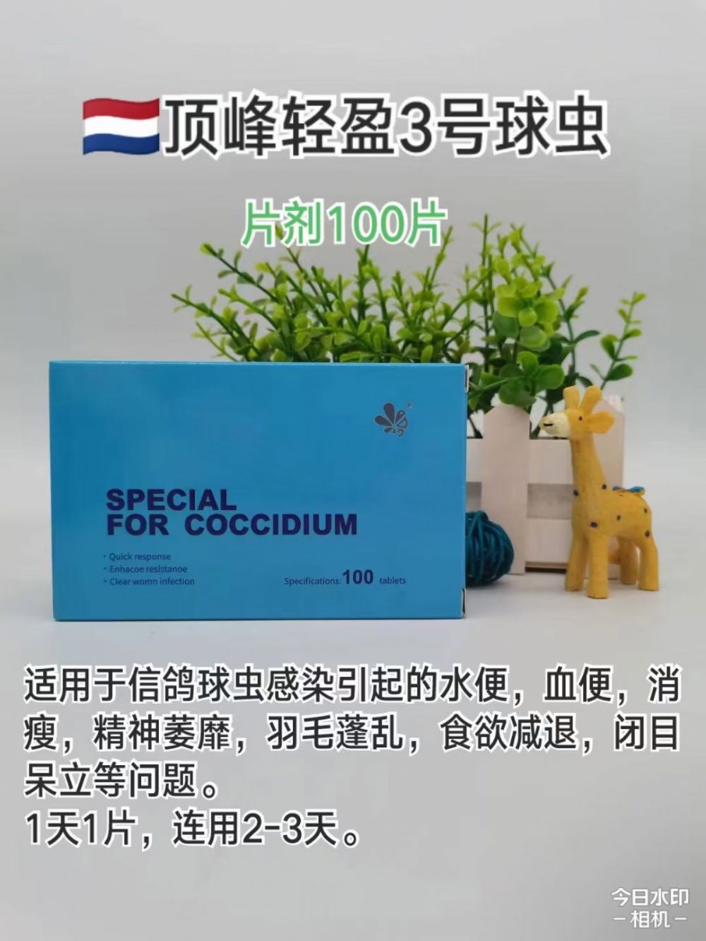 ????荷兰顶峰轻盈3号(球虫专用片剂)针对球虫引起的水便,绿便,血便,精神萎靡,食欲不振等球虫病。 预防每天一片,连续1-2天, 治疗每天一片,连续2-3天, 每盒100片装