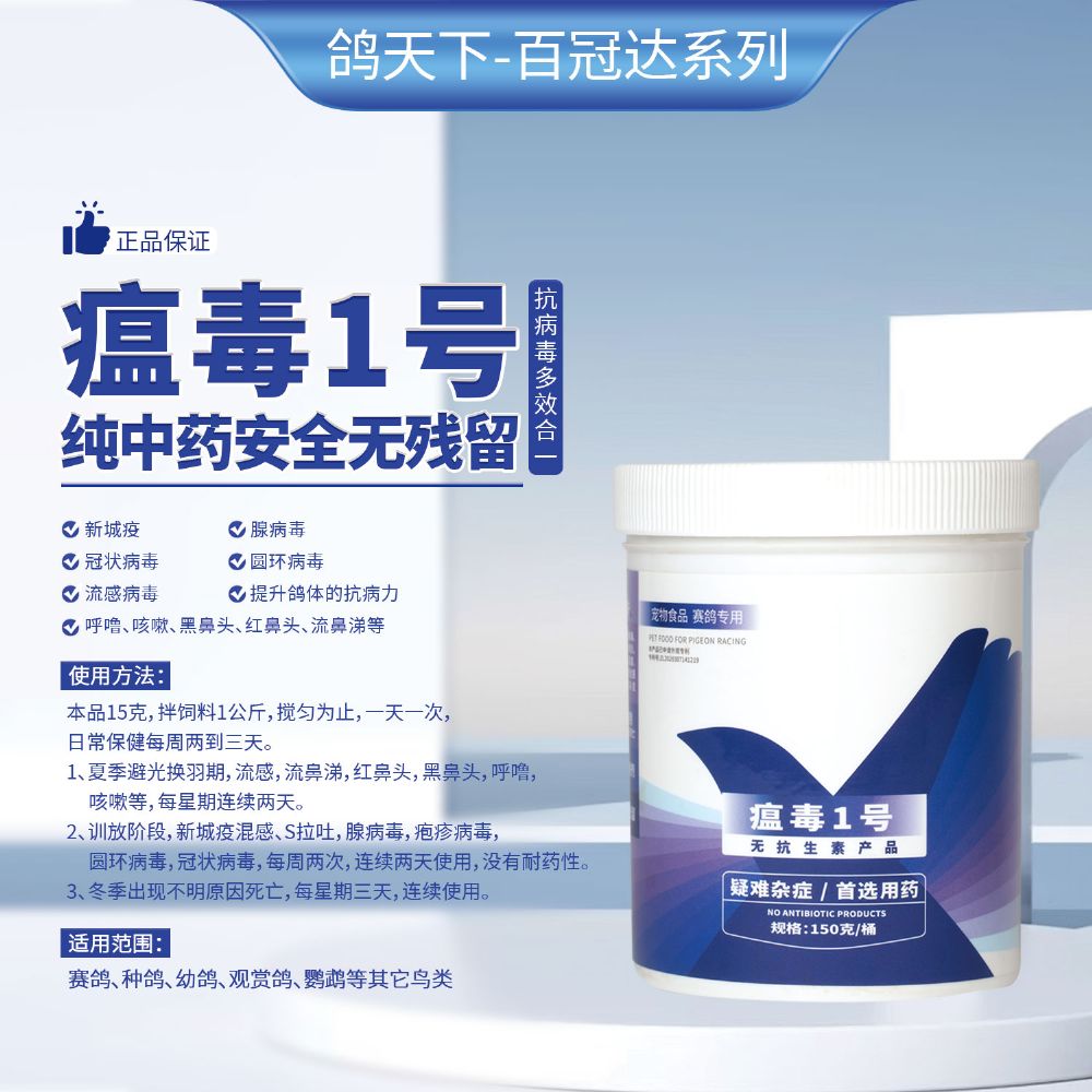 瘟毒1号 疑难杂症首选用药 广谱抗病毒产品 多味中药草本提取精致而成 针对此类情况有很好的预防,治疗效果:流感、黑鼻头、红鼻头、流鼻涕、新城疫、甩拉吐,避光换毛期间可安心使用,不伤鸽体,无残留。 净含量:150g 适用范围:赛鸽、种鸽、幼鸽、观赏鸽、鹦鹉等其它鸟类。 使用方法:拌粮使用。 日常保健预防,使用本品15克拌1000克粮食,搅拌均匀为止,连续使用两天。 控制鸽群发病,使用本品25克拌1000克粮食,搅拌均匀为止,连续使用3-5天。