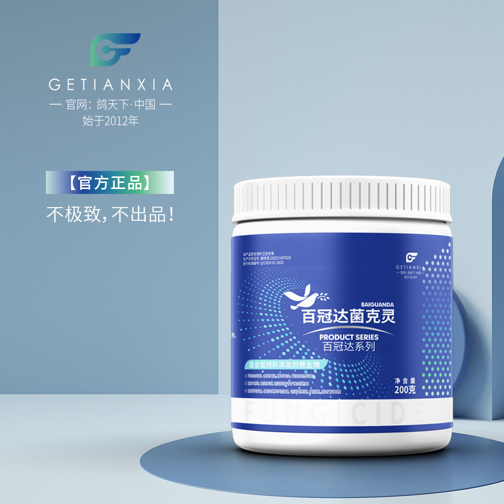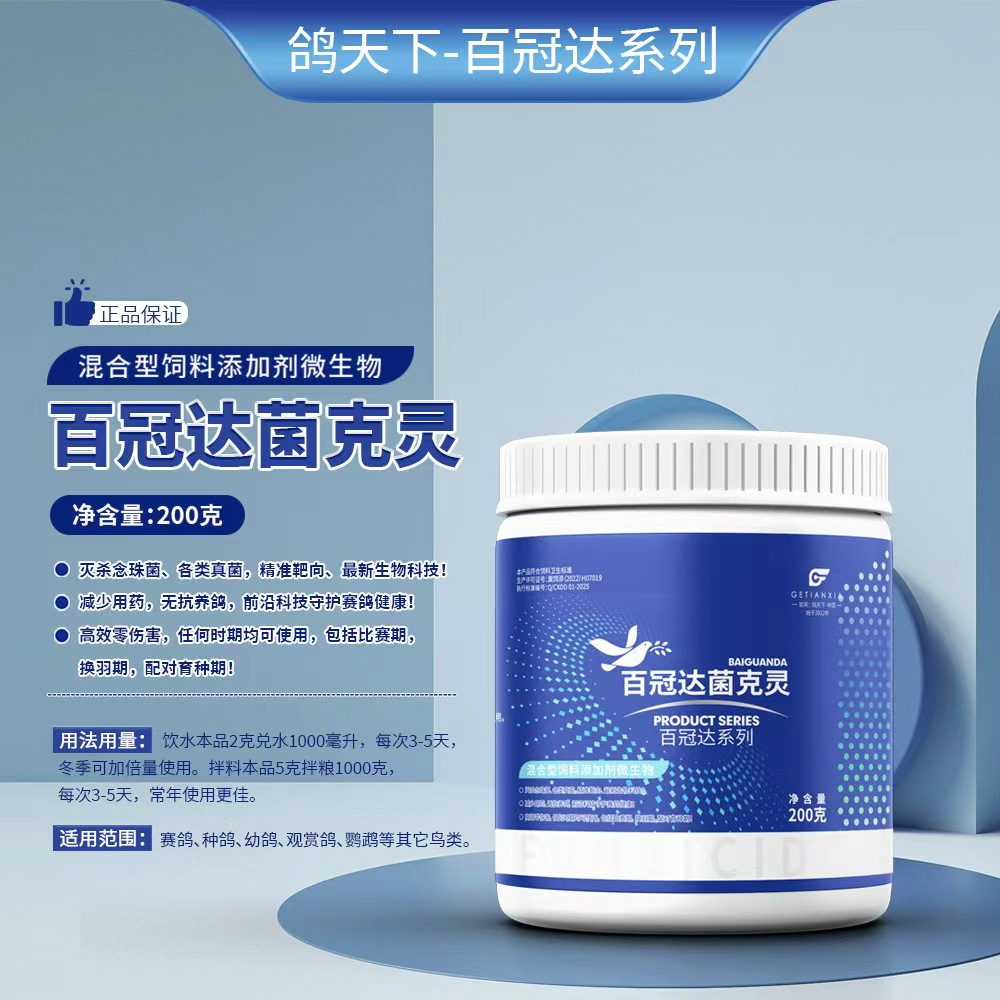 百冠达菌克灵(念珠菌、真菌) 灭杀念珠菌、各类真菌,精准靶向、最新生物科技; 减少用药,无抗养鸽,前沿科技守护赛鸽健康; 0抗生素,0化学杀虫剂,任何时期使用,无药残风险; 净含量:200g/瓶