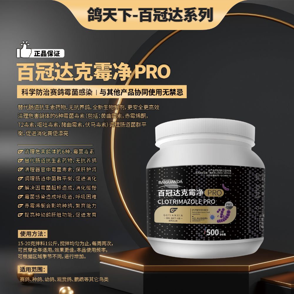百冠达克霉净PRO-科学防治赛鸽霉菌感染 替代肠道抗生素药物,无抗养鸽 全新生物制剂,更安全更高效 清理危害鸽体的6种霉菌毒素(包括:黄曲霉素,赤霉烯酮,T2毒素,呕吐毒素,赭曲霉素,伏马毒素) 调理肠道菌群平衡,促进消化粪便漂亮 与其他产品协同使用无禁忌 净含量:500g/罐 适用范围:赛鸽、种鸽、幼鸽、观赏鸽。 使用方法:15-20克拌料1公斤,搅拌均匀为止,每周两次,可贯穿全年适用,效果更佳。 本品使用频率,可根据区域季节不同,进行增加。