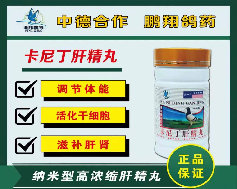 鹏翔-卡尼丁肝精丸 本品由卡尼丁、护肝素、多种氨基酸等组成的高浓缩、纳米型高能量肝精,排肠毒、活化肝细胞,滋补肝肾,调节体能,针对多关赛事归巢恢复体能有特效。注:请分组比较赛鸽翔绩,验证药效。