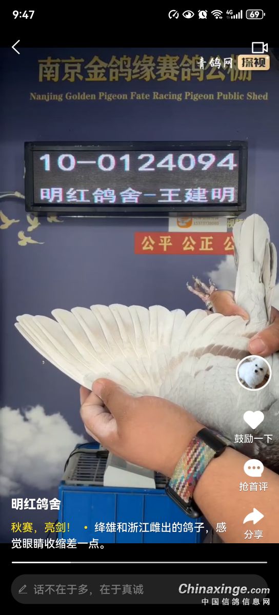 星期三上午7点35淮安火车头特比环第四关开笼,冠军2点到家,分速1380,我的鸽子0178816于2点14进棚,分速1330,四关综合分速4111,特比0178802第二个进棚,分速1280,特比0178805也顺利回来,综合分速4530,当天回来3只,第二天中午最后一只特比0178810回来,第四关没有丢鸽子,遗憾的是特比10,没有当天回来,不然也能保持进奖的机会,第五关570公里,B组取100名进奖,第四关到现在回来了482羽,归巢率81.8%,我的特比05排第四关205名,特比16排名赛季最佳56名。 本赛季还剩下最后一关,看看能不能保本,就看05能不能进前50名,16能不能进前100名了,好消息是02状态慢慢上来了,这给秋棚的鸽子一点希望。金鸽缘绛雄和它同父母,在公棚也是不温不火,不好的消息是药都小鸽子没有上笼,那边答应退费。 金鸽缘今天180公里集鸽,看好特比04的同窝灰,特比环04由于撞伤,没有参加特比环比赛,这两次路训80-50公里都第一个回来。平凉9号160公里集鸽,准备等金鸽缘180公里比赛结束再打指定。