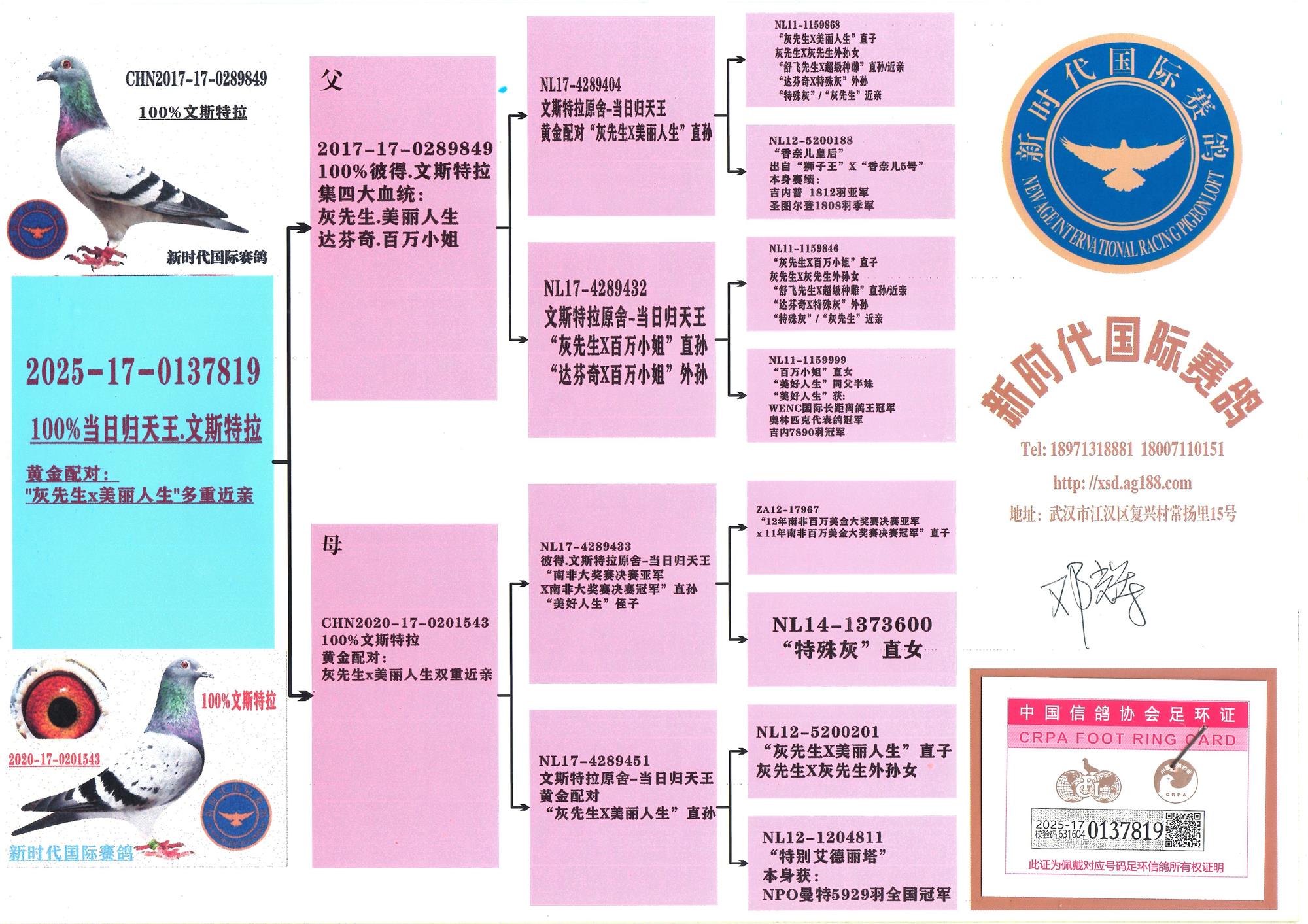 其父亲“灰先生”是大师级镇舍种公,本身也是超级赛将,曾荣获2004年荷兰WHZB全国雄鸽鸽王冠军以及2003年全国雄鸽鸽王季军。2009和2010年“灰先生”的后代为彼德.文斯特拉鸽舍带来了无比巨大的成功!
