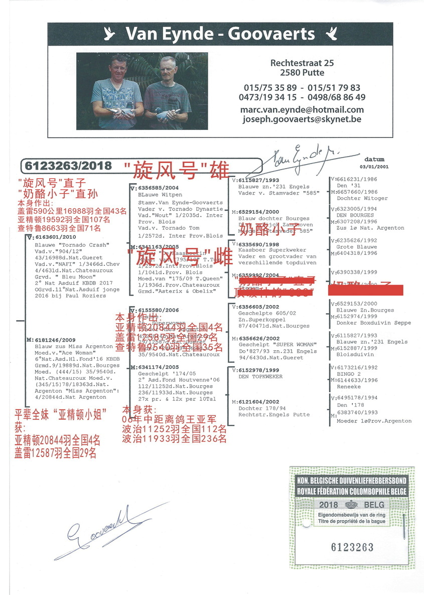 “旋风号”配对雌鸽,历史上最佳配对之一!