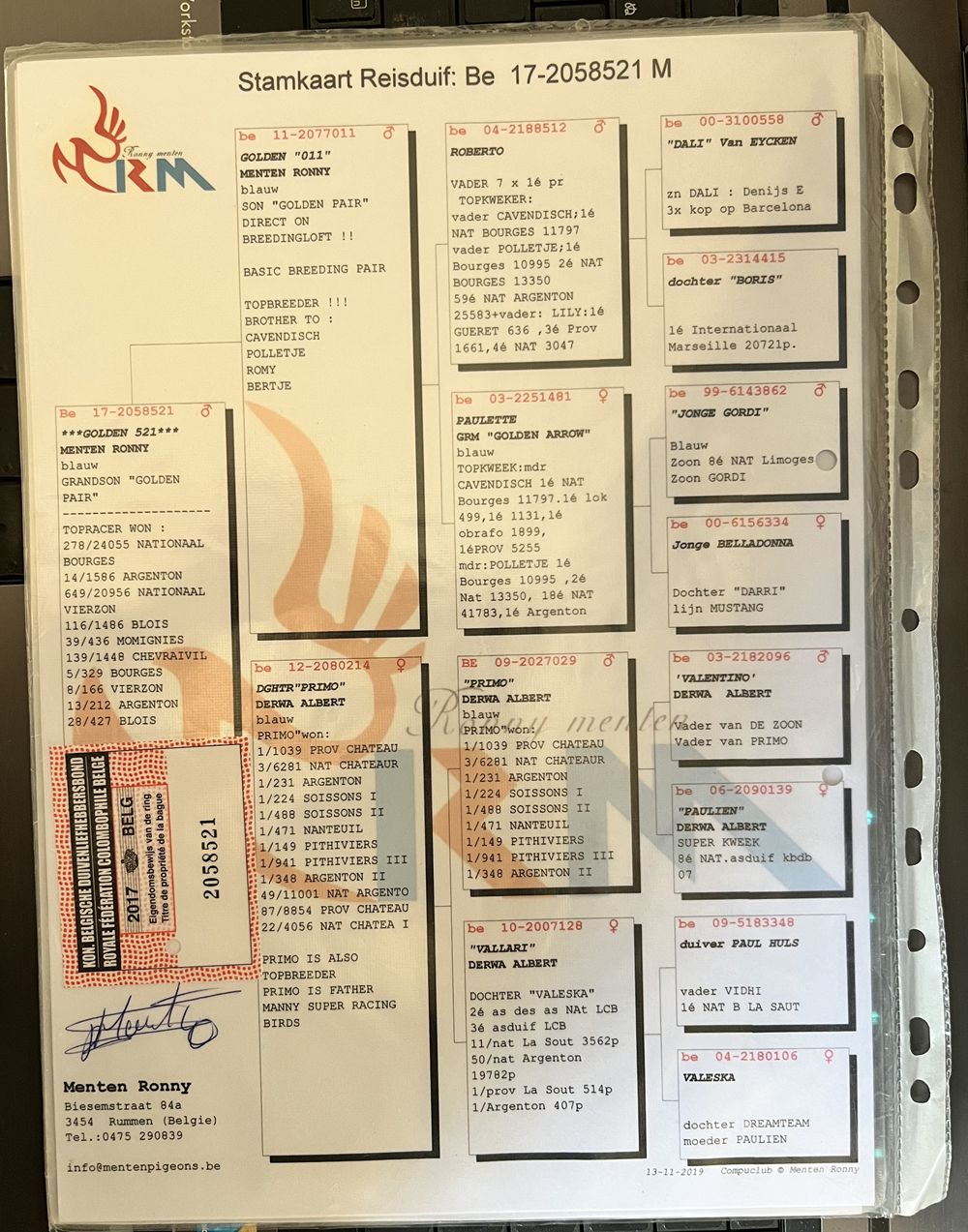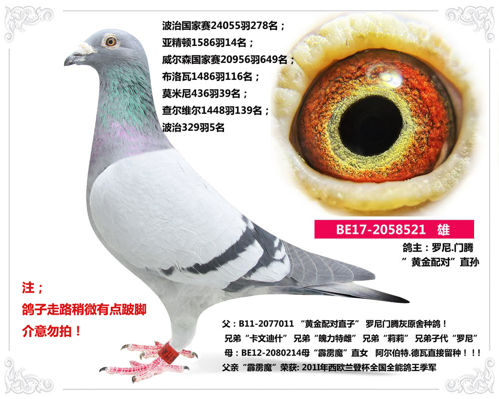 父:B11-2077011 “黄金配对直子” 罗尼门腾灰原舍种鸽! 兄弟“卡文迪什” 兄弟“魄力特雌” 兄弟“莉莉” 兄弟子代“罗尼”