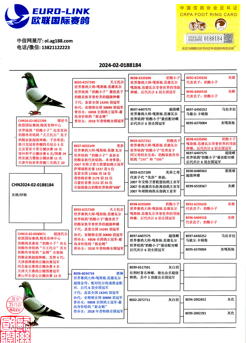 1603957 世界铭鸽”最佳基特尔“高代近亲 ¥3900元 4次