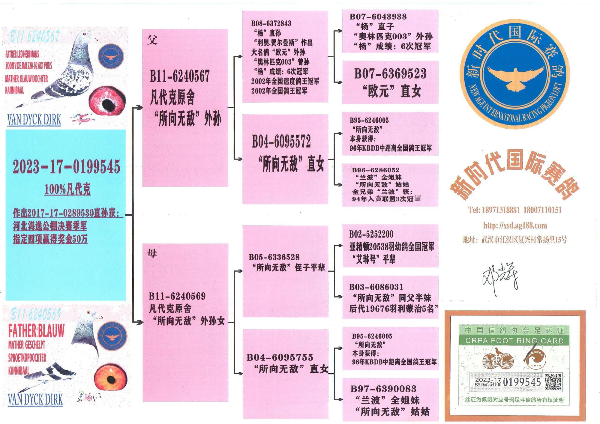 4、“玉明”( NL98-5821450):作出“爱神”(03年法国奥林匹克荷兰长距离冠军)和荷兰全国长距离鸽王冠军等。