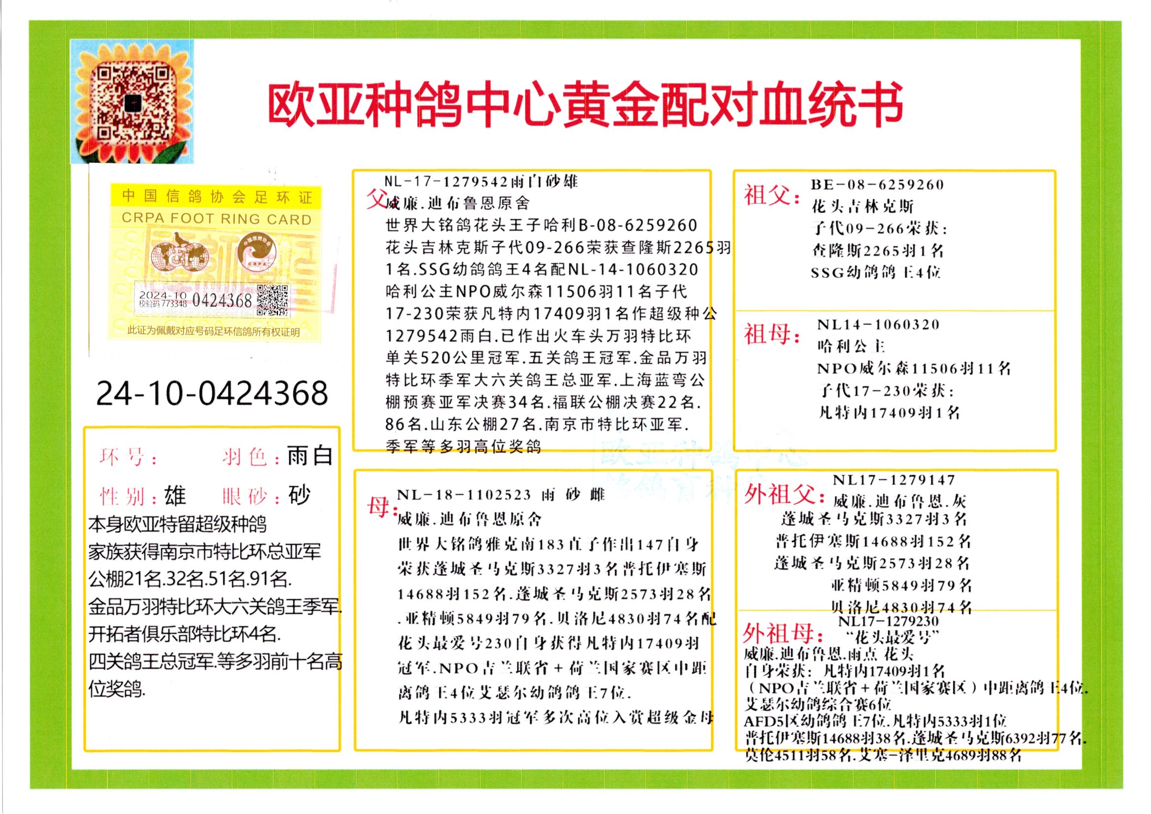 24年秋南京特比环欧亚荣获大团体冠军.小团体冠军551公里大特比13名.14名.16名.19名.20名.21名.24名.26名.27名.28名.42名.52名.54名.57名.65名.66名.68名.70名.71名.72名.74名.76名.80名.82名.83名.84名.85名.86名.90名.92名.110名.116名.121名.122名.128名.131名.158名.161名.164名.165名.166名.172名.174名.177名.182名.195名.196名.201名.205名.208名.210名.216名.253名.269名.275名.276名.294名.296名.299名,,24年秋云南天南铜都公棚决赛415名.天南铜都小棚决赛409名.云南玉活公棚决赛102名.490名.团体32名上笼二羽进二羽,天南铜都大棚506公里决赛445名。热烈祝贺河北省巨鹿县李兰生老师用欧亚泰山号血系连续十一年夺冠军,河北省国家赛冠军.全国季军等多次前十名高位,扬州王军王总用欧亚利奥24年春季获山东翔宇公棚决赛33名盖比53名。南京刘正龙刘总用欧亚盖比获得24年秋山东潍坊国际公棚决赛42名.精英赛30名.三关鸽王71名.决赛86名.加站赛16名.南京市特比环A组鸽王9名.B组鸽王5名.6名.C组鸽王5名.精英赛冠军4名.技能赛A组冠军4名.5名.秦淮区特比环荣获15名.46名.48名.87名。四川西昌徐亮徐总用欧亚利奥获得凉山州聚友决赛177名.第二关亚军双关鸽王19名.三关鸽王105名.云南豪庭公棚决赛603名。热烈祝贺24年四川重庆翔园鸽舍用欧亚泰山号荣获春季400公里冠军.秋季500公里冠军,河北王总用詹森X利奥获得千羽千翔公棚400公里冠军,广东蔡楷焕荣获24年秋爱好者 赛鸽俱乐部三关鸽王季军.一关420公里99名.二关450公里11名.三关520公里32名.单关季军.7名.12名,江西李卫兴荣获贵州红枫公棚8名.共翔俱乐部寄养棚四关综合鸽王30名.一关400公里78名.二关500公里55名.三关520公里37名.四关500公里57名.同父母获公棚18名.雷鸣获得武汉黄浦育翔中心冠军,四川陈文获得四川明鸿俱乐部300公里梦幻2名.3名.4名.9名.10名.13名.14名.15名.31名.34名.40名.41名.42名.43名.69名.71名.72名.73名.74名.94名.95名.97名.98名.99名.419公里决赛荣获总冠军7名.总共归巢9羽,四川徐亮获豪庭决赛603名,山西郑勇获得山西泰鑫公棚决赛255名詹森红狐,热烈祝贺马总获得开尔(飞跃队)决赛9名获奖金1310000万元.第一关52名,天津津福资赛180公里96名.获奖金429543万元,欧亚支持全国鸽友24年秋多人报喜 祝大家取得更好成绩,给欧亚报喜鸽友欧亚决定给每人赠送一羽超级种鸽。欧亚俱乐部特比环多关鸽王成绩:15年秋淮安特比环黑色星期一全会上笼9700多羽,当天无鸽归巢,第二天全会归巢357羽,本舍归巢158羽.前十名八羽.前一百名归巢57羽,16年春季获五关鸽王总冠军,总亚军四名.六名.七名.九名.十名.晶艺俱乐部520公里冠亚季军5名.6名.7名.9名.11名等,火车头冠军.季军6名.8名.9名.10名,16年秋晶艺俱乐部特比环520公里亚军.季军4名.6名.7名.9名,15年春南京白下特比环冠军.亚军.季军6名.7名.8名.9名.10名.指定鸽A B组获得冠军.亚军.季军4名.5名.,17年淮安特比环亚军.4名.5名.7名.8名.10名.六关鸽王总冠军.4名.6名.9名.10名,寄养棚宿迁刘总20羽特比环获冠军.季军.4名.7名.8名.9名等。18年荣获万羽特比环六关鸽王总冠军.总亚军.总季军.6名.8名.十名.单关四羽冠军.二羽亚军.四羽季军.前十名27羽。19年秋万羽特比环六关鸽王总亚军.总季军.5名.8名等,单关二羽冠军.三羽亚军.一羽季军前十名31羽。20年秋淮安市鸽会四关特比环大赛风雨无阻鸽王亚军.鸽王六名,金品俱乐部万羽特比环六关鸽王总冠军,总亚军.四名.五名.六名.七名.八名.十名.前二百名鸽王35羽,单关冠亚季军前十名四十多羽,火车头五关鸽王季军.六名.八名.前二百名鸽王十七羽。20年春荣获淮安五区一市四关鸽王总冠军.亚军.四名.八名.九名。21年秋荣获金品万羽特比环大赛六关鸽王总亚军.总季军.四名.七名.九名.十名.单关冠亚军季军前十名三十多羽。火车头协会鸽王六名.七名.十名.单关前十名十七羽。22年秋荣获鸽王总冠军.总亚军.5名.7名.8名.9名.11名.单关冠亚季军前十名三十多羽,第一关单关前二百名四十多羽,第二关前二百名三十多羽,第三关前二百名四十多羽,第四关前二百名四十多羽,第五关前一百名53羽。23年秋荣获鸽王季军.五名.八名.十名.13名.17名.20名.27名等多羽鸽王.单关前十名二十多羽。公棚.寄养棚部分成绩:16年秋宁夏黄河公棚总冠军电脑戈马力指定通炮冠军,17年送八羽参赛获得鸽王八名进奖四名,支持韩总荣获八名。支持鸽友荣获宁夏中卫公棚决赛总冠军.精英赛冠军,支持18年宁夏黄河公棚决赛冠军詹森X泰山。安徽鼎博寄养棚院内外四关鸽王总冠军.鸽王十七名.三十七名同窝,鸽王39名.42名.58名.67名。18年山东公棚预赛冠军.决赛65名.送八羽进奖五羽.指定获奔驰汽车一辆。支持鸽友获得云南蓝云公棚冠军.盖比X佛卡门。支持鸽友荣获云南银集公棚决赛冠军 詹森427X520血系 速度赛6700羽冠军。17年荣获金马俱乐部寄养棚四关鸽王总冠军.季军.六名.八名.第一关冠军.亚军.季军四名.七名.十一名.金牌教练奖。支持鸽友18年北京费翔公棚预赛九名电脑X桑杰士,支持鸽友荣获陕西威力公棚决赛11名.内蒙古临河寄养棚四关鸽王六名.詹森配泰山,支持河北王总用欧亚詹森427配胡本喜获20年秋开尔青年棚季军。云南东荣公棚16年预赛冠军.决赛77名.17年决赛12名.詹森红狐X泰山,17年平安公棚决赛4名 詹森427。欧亚获得21年金母寄养棚第一关四名.第二关5名.第三关5名.6名.7名.10名.三关鸽王总冠军,四关鸽王14名.十羽鸽王。支持河