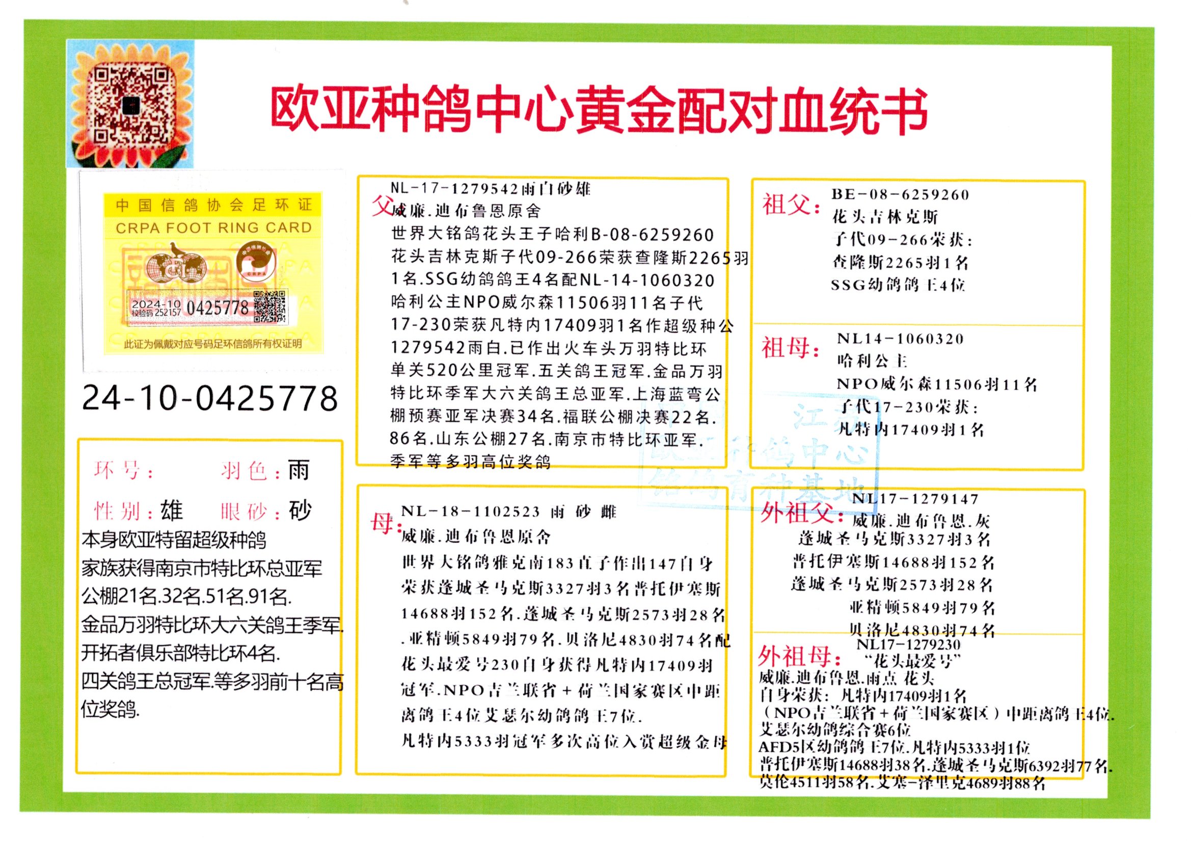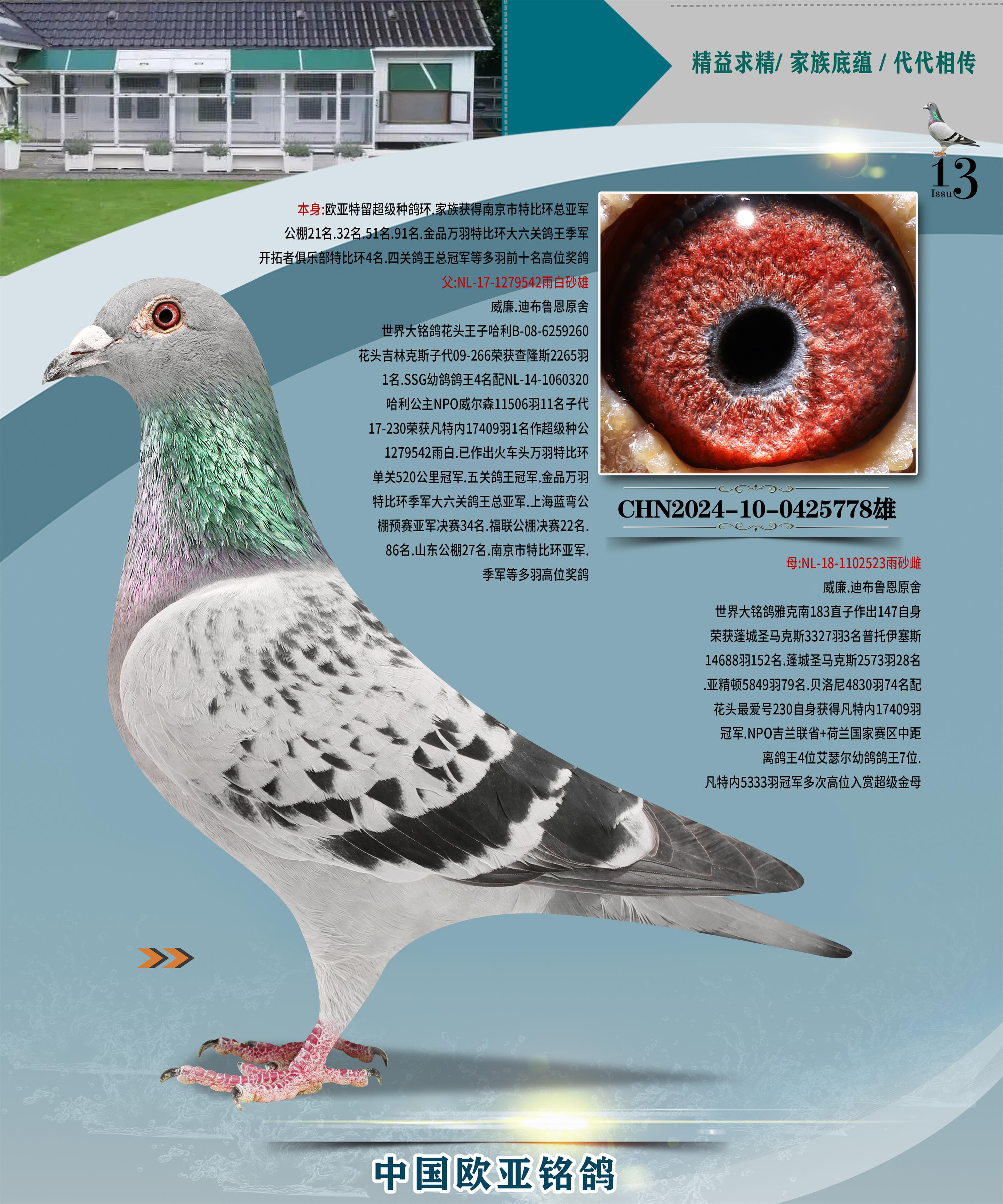 24年秋南京特比环欧亚荣获大团体冠军.小团体冠军551公里大特比13名.14名.16名.19名.20名.21名.24名.26名.27名.28名.42名.52名.54名.57名.65名.66名.68名.70名.71名.72名.74名.76名.80名.82名.83名.84名.85名.86名.90名.92名.110名.116名.121名.122名.128名.131名.158名.161名.164名.165名.166名.172名.174名.177名.182名.195名.196名.201名.205名.208名.210名.216名.253名.269名.275名.276名.294名.296名.299名,,24年秋云南天南铜都公棚决赛415名.天南铜都小棚决赛409名.云南玉活公棚决赛102名.490名.团体32名上笼二羽进二羽,天南铜都大棚506公里决赛445名。热烈祝贺河北省巨鹿县李兰生老师用欧亚泰山号血系连续十一年夺冠军,河北省国家赛冠军.全国季军等多次前十名高位,扬州王军王总用欧亚利奥24年春季获山东翔宇公棚决赛33名盖比53名。南京刘正龙刘总用欧亚盖比获得24年秋山东潍坊国际公棚决赛42名.精英赛30名.三关鸽王71名.决赛86名.加站赛16名.南京市特比环A组鸽王9名.B组鸽王5名.6名.C组鸽王5名.精英赛冠军4名.技能赛A组冠军4名.5名.秦淮区特比环荣获15名.46名.48名.87名。四川西昌徐亮徐总用欧亚利奥获得凉山州聚友决赛177名.第二关亚军双关鸽王19名.三关鸽王105名.云南豪庭公棚决赛603名。热烈祝贺24年四川重庆翔园鸽舍用欧亚泰山号荣获春季400公里冠军.秋季500公里冠军,河北王总用詹森X利奥获得千羽千翔公棚400公里冠军,广东蔡楷焕荣获24年秋爱好者 赛鸽俱乐部三关鸽王季军.一关420公里99名.二关450公里11名.三关520公里32名.单关季军.7名.12名,江西李卫兴荣获贵州红枫公棚8名.共翔俱乐部寄养棚四关综合鸽王30名.一关400公里78名.二关500公里55名.三关520公里37名.四关500公里57名.同父母获公棚18名.雷鸣获得武汉黄浦育翔中心冠军,四川陈文获得四川明鸿俱乐部300公里梦幻2名.3名.4名.9名.10名.13名.14名.15名.31名.34名.40名.41名.42名.43名.69名.71名.72名.73名.74名.94名.95名.97名.98名.99名.419公里决赛荣获总冠军7名.总共归巢9羽,四川徐亮获豪庭决赛603名,山西郑勇获得山西泰鑫公棚决赛255名詹森红狐,热烈祝贺马总获得开尔(飞跃队)决赛9名获奖金1310000万元.第一关52名,天津津福资赛180公里96名.获奖金429543万元,欧亚支持全国鸽友24年秋多人报喜 祝大家取得更好成绩,给欧亚报喜鸽友欧亚决定给每人赠送一羽超级种鸽。欧亚俱乐部特比环多关鸽王成绩:15年秋淮安特比环黑色星期一全会上笼9700多羽,当天无鸽归巢,第二天全会归巢357羽,本舍归巢158羽.前十名八羽.前一百名归巢57羽,16年春季获五关鸽王总冠军,总亚军四名.六名.七名.九名.十名.晶艺俱乐部520公里冠亚季军5名.6名.7名.9名.11名等,火车头冠军.季军6名.8名.9名.10名,16年秋晶艺俱乐部特比环520公里亚军.季军4名.6名.7名.9名,15年春南京白下特比环冠军.亚军.季军6名.7名.8名.9名.10名.指定鸽A B组获得冠军.亚军.季军4名.5名.,17年淮安特比环亚军.4名.5名.7名.8名.10名.六关鸽王总冠军.4名.6名.9名.10名,寄养棚宿迁刘总20羽特比环获冠军.季军.4名.7名.8名.9名等。18年荣获万羽特比环六关鸽王总冠军.总亚军.总季军.6名.8名.十名.单关四羽冠军.二羽亚军.四羽季军.前十名27羽。19年秋万羽特比环六关鸽王总亚军.总季军.5名.8名等,单关二羽冠军.三羽亚军.一羽季军前十名31羽。20年秋淮安市鸽会四关特比环大赛风雨无阻鸽王亚军.鸽王六名,金品俱乐部万羽特比环六关鸽王总冠军,总亚军.四名.五名.六名.七名.八名.十名.前二百名鸽王35羽,单关冠亚季军前十名四十多羽,火车头五关鸽王季军.六名.八名.前二百名鸽王十七羽。20年春荣获淮安五区一市四关鸽王总冠军.亚军.四名.八名.九名。21年秋荣获金品万羽特比环大赛六关鸽王总亚军.总季军.四名.七名.九名.十名.单关冠亚军季军前十名三十多羽。火车头协会鸽王六名.七名.十名.单关前十名十七羽。22年秋荣获鸽王总冠军.总亚军.5名.7名.8名.9名.11名.单关冠亚季军前十名三十多羽,第一关单关前二百名四十多羽,第二关前二百名三十多羽,第三关前二百名四十多羽,第四关前二百名四十多羽,第五关前一百名53羽。23年秋荣获鸽王季军.五名.八名.十名.13名.17名.20名.27名等多羽鸽王.单关前十名二十多羽。公棚.寄养棚部分成绩:16年秋宁夏黄河公棚总冠军电脑戈马力指定通炮冠军,17年送八羽参赛获得鸽王八名进奖四名,支持韩总荣获八名。支持鸽友荣获宁夏中卫公棚决赛总冠军.精英赛冠军,支持18年宁夏黄河公棚决赛冠军詹森X泰山。安徽鼎博寄养棚院内外四关鸽王总冠军.鸽王十七名.三十七名同窝,鸽王39名.42名.58名.67名。18年山东公棚预赛冠军.决赛65名.送八羽进奖五羽.指定获奔驰汽车一辆。支持鸽友获得云南蓝云公棚冠军.盖比X佛卡门。支持鸽友荣获云南银集公棚决赛冠军 詹森427X520血系 速度赛6700羽冠军。17年荣获金马俱乐部寄养棚四关鸽王总冠军.季军.六名.八名.第一关冠军.亚军.季军四名.七名.十一名.金牌教练奖。支持鸽友18年北京费翔公棚预赛九名电脑X桑杰士,支持鸽友荣获陕西威力公棚决赛11名.内蒙古临河寄养棚四关鸽王六名.詹森配泰山,支持河北王总用欧亚詹森427配胡本喜获20年秋开尔青年棚季军。云南东荣公棚16年预赛冠军.决赛77名.17年决赛12名.詹森红狐X泰山,17年平安公棚决赛4名 詹森427。欧亚获得21年金母寄养棚第一关四名.第二关5名.第三关5名.6名.7名.10名.三关鸽王总冠军,四关鸽王14名.十羽鸽王。支持河