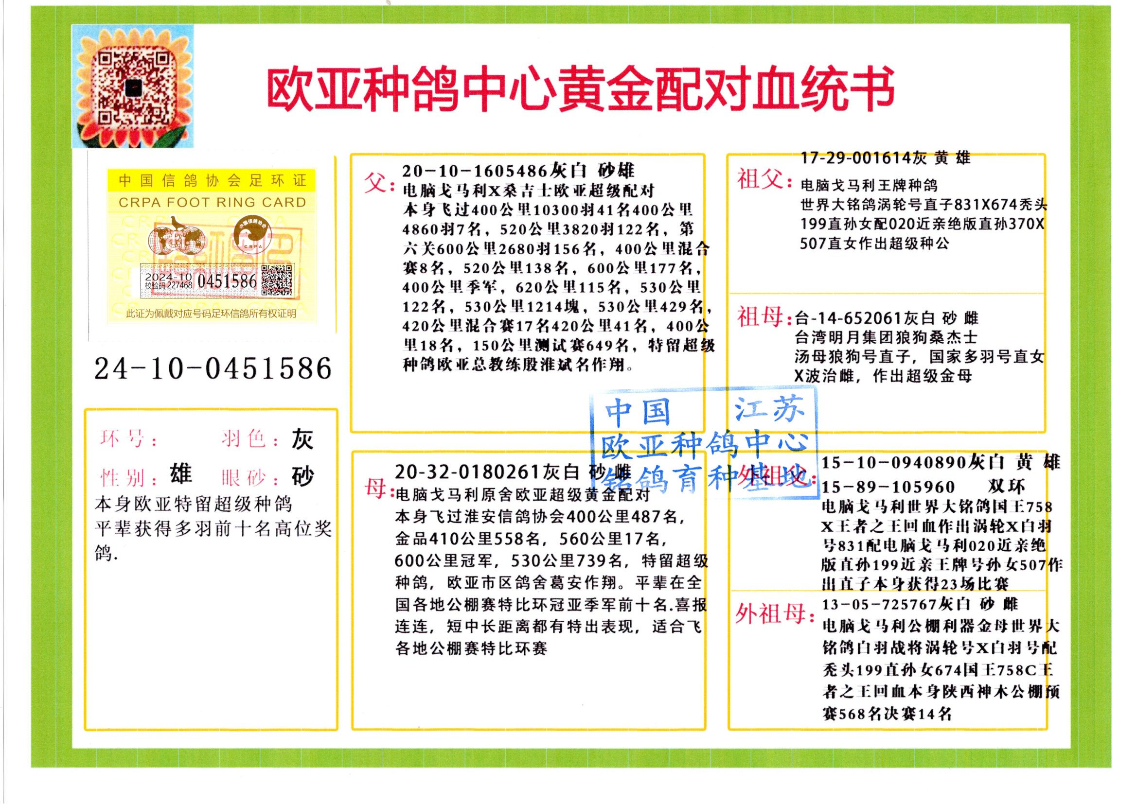 24年秋南京特比环欧亚荣获大团体冠军.小团体冠军551公里大特比13名.14名.16名.19名.20名.21名.24名.26名.27名.28名.42名.52名.54名.57名.65名.66名.68名.70名.71名.72名.74名.76名.80名.82名.83名.84名.85名.86名.90名.92名.110名.116名.121名.122名.128名.131名.158名.161名.164名.165名.166名.172名.174名.177名.182名.195名.196名.201名.205名.208名.210名.216名.253名.269名.275名.276名.294名.296名.299名,,24年秋云南天南铜都公棚决赛415名.天南铜都小棚决赛409名.云南玉活公棚决赛102名.490名.团体32名上笼二羽进二羽,天南铜都大棚506公里决赛445名。热烈祝贺河北省巨鹿县李兰生老师用欧亚泰山号血系连续十一年夺冠军,河北省国家赛冠军.全国季军等多次前十名高位,扬州王军王总用欧亚利奥24年春季获山东翔宇公棚决赛33名盖比53名。南京刘正龙刘总用欧亚盖比获得24年秋山东潍坊国际公棚决赛42名.精英赛30名.三关鸽王71名.决赛86名.加站赛16名.南京市特比环A组鸽王9名.B组鸽王5名.6名.C组鸽王5名.精英赛冠军4名.技能赛A组冠军4名.5名.秦淮区特比环荣获15名.46名.48名.87名。四川西昌徐亮徐总用欧亚利奥获得凉山州聚友决赛177名.第二关亚军双关鸽王19名.三关鸽王105名.云南豪庭公棚决赛603名。热烈祝贺24年四川重庆翔园鸽舍用欧亚泰山号荣获春季400公里冠军.秋季500公里冠军,河北王总用詹森X利奥获得千羽千翔公棚400公里冠军,广东蔡楷焕荣获24年秋爱好者 赛鸽俱乐部三关鸽王季军.一关420公里99名.二关450公里11名.三关520公里32名.单关季军.7名.12名,江西李卫兴荣获贵州红枫公棚8名.共翔俱乐部寄养棚四关综合鸽王30名.一关400公里78名.二关500公里55名.三关520公里37名.四关500公里57名.同父母获公棚18名.雷鸣获得武汉黄浦育翔中心冠军,四川陈文获得四川明鸿俱乐部300公里梦幻2名.3名.4名.9名.10名.13名.14名.15名.31名.34名.40名.41名.42名.43名.69名.71名.72名.73名.74名.94名.95名.97名.98名.99名.419公里决赛荣获总冠军7名.总共归巢9羽,四川徐亮获豪庭决赛603名,山西郑勇获得山西泰鑫公棚决赛255名詹森红狐,热烈祝贺马总获得开尔(飞跃队)决赛9名获奖金1310000万元.第一关52名,天津津福资赛180公里96名.获奖金429543万元,欧亚支持全国鸽友24年秋多人报喜 祝大家取得更好成绩,给欧亚报喜鸽友欧亚决定给每人赠送一羽超级种鸽。欧亚俱乐部特比环多关鸽王成绩:15年秋淮安特比环黑色星期一全会上笼9700多羽,当天无鸽归巢,第二天全会归巢357羽,本舍归巢158羽.前十名八羽.前一百名归巢57羽,16年春季获五关鸽王总冠军,总亚军四名.六名.七名.九名.十名.晶艺俱乐部520公里冠亚季军5名.6名.7名.9名.11名等,火车头冠军.季军6名.8名.9名.10名,16年秋晶艺俱乐部特比环520公里亚军.季军4名.6名.7名.9名,15年春南京白下特比环冠军.亚军.季军6名.7名.8名.9名.10名.指定鸽A B组获得冠军.亚军.季军4名.5名.,17年淮安特比环亚军.4名.5名.7名.8名.10名.六关鸽王总冠军.4名.6名.9名.10名,寄养棚宿迁刘总20羽特比环获冠军.季军.4名.7名.8名.9名等。18年荣获万羽特比环六关鸽王总冠军.总亚军.总季军.6名.8名.十名.单关四羽冠军.二羽亚军.四羽季军.前十名27羽。19年秋万羽特比环六关鸽王总亚军.总季军.5名.8名等,单关二羽冠军.三羽亚军.一羽季军前十名31羽。20年秋淮安市鸽会四关特比环大赛风雨无阻鸽王亚军.鸽王六名,金品俱乐部万羽特比环六关鸽王总冠军,总亚军.四名.五名.六名.七名.八名.十名.前二百名鸽王35羽,单关冠亚季军前十名四十多羽,火车头五关鸽王季军.六名.八名.前二百名鸽王十七羽。20年春荣获淮安五区一市四关鸽王总冠军.亚军.四名.八名.九名。21年秋荣获金品万羽特比环大赛六关鸽王总亚军.总季军.四名.七名.九名.十名.单关冠亚军季军前十名三十多羽。火车头协会鸽王六名.七名.十名.单关前十名十七羽。22年秋荣获鸽王总冠军.总亚军.5名.7名.8名.9名.11名.单关冠亚季军前十名三十多羽,第一关单关前二百名四十多羽,第二关前二百名三十多羽,第三关前二百名四十多羽,第四关前二百名四十多羽,第五关前一百名53羽。23年秋荣获鸽王季军.五名.八名.十名.13名.17名.20名.27名等多羽鸽王.单关前十名二十多羽。公棚.寄养棚部分成绩:16年秋宁夏黄河公棚总冠军电脑戈马力指定通炮冠军,17年送八羽参赛获得鸽王八名进奖四名,支持韩总荣获八名。支持鸽友荣获宁夏中卫公棚决赛总冠军.精英赛冠军,支持18年宁夏黄河公棚决赛冠军詹森X泰山。安徽鼎博寄养棚院内外四关鸽王总冠军.鸽王十七名.三十七名同窝,鸽王39名.42名.58名.67名。18年山东公棚预赛冠军.决赛65名.送八羽进奖五羽.指定获奔驰汽车一辆。支持鸽友获得云南蓝云公棚冠军.盖比X佛卡门。支持鸽友荣获云南银集公棚决赛冠军 詹森427X520血系 速度赛6700羽冠军。17年荣获金马俱乐部寄养棚四关鸽王总冠军.季军.六名.八名.第一关冠军.亚军.季军四名.七名.十一名.金牌教练奖。支持鸽友18年北京费翔公棚预赛九名电脑X桑杰士,支持鸽友荣获陕西威力公棚决赛11名.内蒙古临河寄养棚四关鸽王六名.詹森配泰山,支持河北王总用欧亚詹森427配胡本喜获20年秋开尔青年棚季军。云南东荣公棚16年预赛冠军.决赛77名.17年决赛12名.詹森红狐X泰山,17年平安公棚决赛4名 詹森427。欧亚获得21年金母寄养棚第一关四名.第二关5名.第三关5名.6名.7名.10名.三关鸽王总冠军,四关鸽王14名.十羽鸽王。支持河