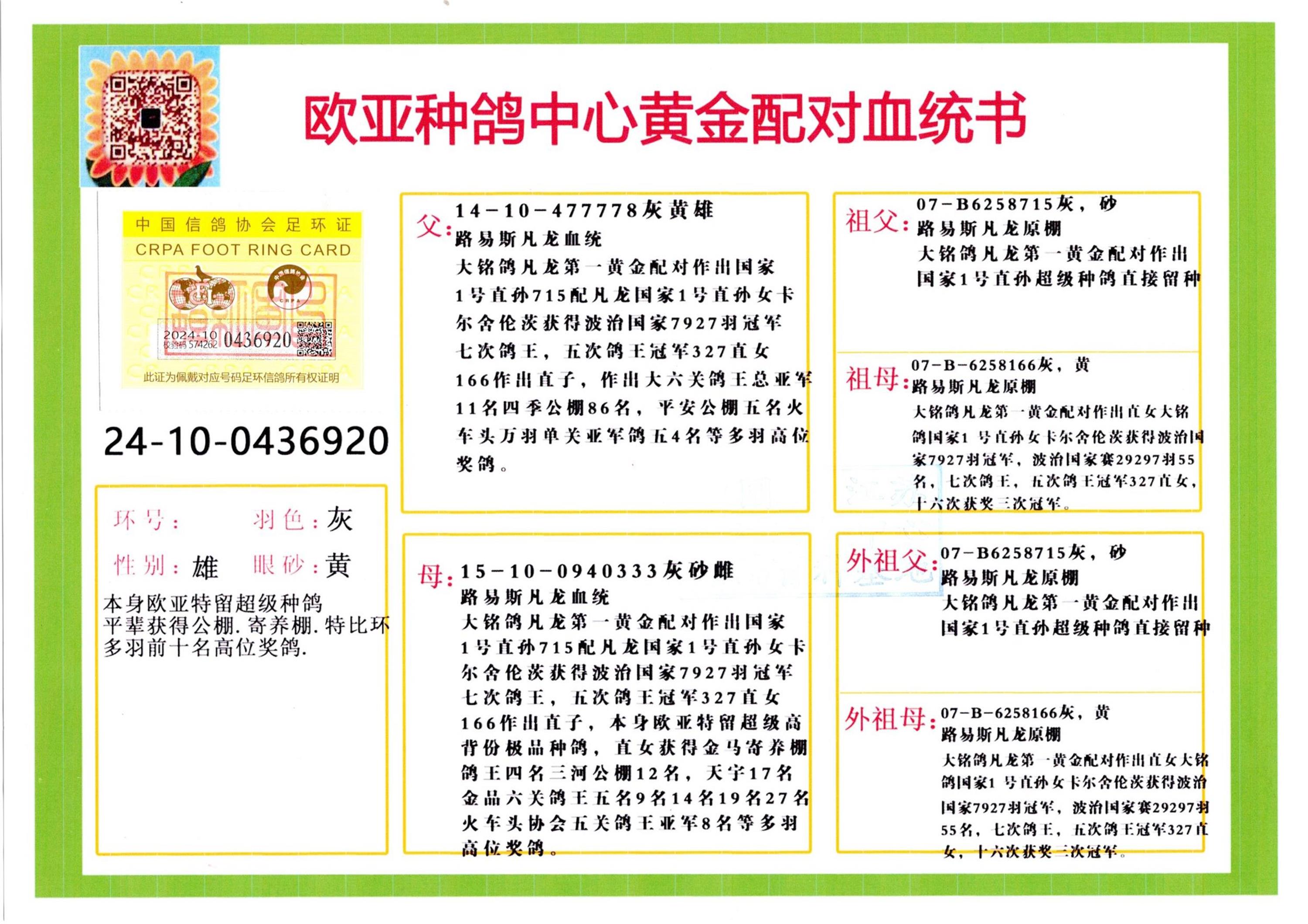24年秋南京特比环欧亚荣获大团体冠军.小团体冠军551公里大特比13名.14名.16名.19名.20名.21名.24名.26名.27名.28名.42名.52名.54名.57名.65名.66名.68名.70名.71名.72名.74名.76名.80名.82名.83名.84名.85名.86名.90名.92名.110名.116名.121名.122名.128名.131名.158名.161名.164名.165名.166名.172名.174名.177名.182名.195名.196名.201名.205名.208名.210名.216名.253名.269名.275名.276名.294名.296名.299名,,24年秋云南天南铜都公棚决赛415名.天南铜都小棚决赛409名.云南玉活公棚决赛102名.490名.团体32名上笼二羽进二羽,天南铜都大棚506公里决赛445名。热烈祝贺河北省巨鹿县李兰生老师用欧亚泰山号血系连续十一年夺冠军,河北省国家赛冠军.全国季军等多次前十名高位,扬州王军王总用欧亚利奥24年春季获山东翔宇公棚决赛33名盖比53名。南京刘正龙刘总用欧亚盖比获得24年秋山东潍坊国际公棚决赛42名.精英赛30名.三关鸽王71名.决赛86名.加站赛16名.南京市特比环A组鸽王9名.B组鸽王5名.6名.C组鸽王5名.精英赛冠军4名.技能赛A组冠军4名.5名.秦淮区特比环荣获15名.46名.48名.87名。四川西昌徐亮徐总用欧亚利奥获得凉山州聚友决赛177名.第二关亚军双关鸽王19名.三关鸽王105名.云南豪庭公棚决赛603名。热烈祝贺24年四川重庆翔园鸽舍用欧亚泰山号荣获春季400公里冠军.秋季500公里冠军,河北王总用詹森X利奥获得千羽千翔公棚400公里冠军,广东蔡楷焕荣获24年秋爱好者 赛鸽俱乐部三关鸽王季军.一关420公里99名.二关450公里11名.三关520公里32名.单关季军.7名.12名,江西李卫兴荣获贵州红枫公棚8名.共翔俱乐部寄养棚四关综合鸽王30名.一关400公里78名.二关500公里55名.三关520公里37名.四关500公里57名.同父母获公棚18名.雷鸣获得武汉黄浦育翔中心冠军,四川陈文获得四川明鸿俱乐部300公里梦幻2名.3名.4名.9名.10名.13名.14名.15名.31名.34名.40名.41名.42名.43名.69名.71名.72名.73名.74名.94名.95名.97名.98名.99名.419公里决赛荣获总冠军7名.总共归巢9羽,四川徐亮获豪庭决赛603名,山西郑勇获得山西泰鑫公棚决赛255名詹森红狐,热烈祝贺马总获得开尔(飞跃队)决赛9名获奖金1310000万元.第一关52名,天津津福资赛180公里96名.获奖金429543万元,欧亚支持全国鸽友24年秋多人报喜 祝大家取得更好成绩,给欧亚报喜鸽友欧亚决定给每人赠送一羽超级种鸽。欧亚俱乐部特比环多关鸽王成绩:15年秋淮安特比环黑色星期一全会上笼9700多羽,当天无鸽归巢,第二天全会归巢357羽,本舍归巢158羽.前十名八羽.前一百名归巢57羽,16年春季获五关鸽王总冠军,总亚军四名.六名.七名.九名.十名.晶艺俱乐部520公里冠亚季军5名.6名.7名.9名.11名等,火车头冠军.季军6名.8名.9名.10名,16年秋晶艺俱乐部特比环520公里亚军.季军4名.6名.7名.9名,15年春南京白下特比环冠军.亚军.季军6名.7名.8名.9名.10名.指定鸽A B组获得冠军.亚军.季军4名.5名.,17年淮安特比环亚军.4名.5名.7名.8名.10名.六关鸽王总冠军.4名.6名.9名.10名,寄养棚宿迁刘总20羽特比环获冠军.季军.4名.7名.8名.9名等。18年荣获万羽特比环六关鸽王总冠军.总亚军.总季军.6名.8名.十名.单关四羽冠军.二羽亚军.四羽季军.前十名27羽。19年秋万羽特比环六关鸽王总亚军.总季军.5名.8名等,单关二羽冠军.三羽亚军.一羽季军前十名31羽。20年秋淮安市鸽会四关特比环大赛风雨无阻鸽王亚军.鸽王六名,金品俱乐部万羽特比环六关鸽王总冠军,总亚军.四名.五名.六名.七名.八名.十名.前二百名鸽王35羽,单关冠亚季军前十名四十多羽,火车头五关鸽王季军.六名.八名.前二百名鸽王十七羽。20年春荣获淮安五区一市四关鸽王总冠军.亚军.四名.八名.九名。21年秋荣获金品万羽特比环大赛六关鸽王总亚军.总季军.四名.七名.九名.十名.单关冠亚军季军前十名三十多羽。火车头协会鸽王六名.七名.十名.单关前十名十七羽。22年秋荣获鸽王总冠军.总亚军.5名.7名.8名.9名.11名.单关冠亚季军前十名三十多羽,第一关单关前二百名四十多羽,第二关前二百名三十多羽,第三关前二百名四十多羽,第四关前二百名四十多羽,第五关前一百名53羽。23年秋荣获鸽王季军.五名.八名.十名.13名.17名.20名.27名等多羽鸽王.单关前十名二十多羽。公棚.寄养棚部分成绩:16年秋宁夏黄河公棚总冠军电脑戈马力指定通炮冠军,17年送八羽参赛获得鸽王八名进奖四名,支持韩总荣获八名。支持鸽友荣获宁夏中卫公棚决赛总冠军.精英赛冠军,支持18年宁夏黄河公棚决赛冠军詹森X泰山。安徽鼎博寄养棚院内外四关鸽王总冠军.鸽王十七名.三十七名同窝,鸽王39名.42名.58名.67名。18年山东公棚预赛冠军.决赛65名.送八羽进奖五羽.指定获奔驰汽车一辆。支持鸽友获得云南蓝云公棚冠军.盖比X佛卡门。支持鸽友荣获云南银集公棚决赛冠军 詹森427X520血系 速度赛6700羽冠军。17年荣获金马俱乐部寄养棚四关鸽王总冠军.季军.六名.八名.第一关冠军.亚军.季军四名.七名.十一名.金牌教练奖。支持鸽友18年北京费翔公棚预赛九名电脑X桑杰士,支持鸽友荣获陕西威力公棚决赛11名.内蒙古临河寄养棚四关鸽王六名.詹森配泰山,支持河北王总用欧亚詹森427配胡本喜获20年秋开尔青年棚季军。云南东荣公棚16年预赛冠军.决赛77名.17年决赛12名.詹森红狐X泰山,17年平安公棚决赛4名 詹森427。欧亚获得21年金母寄养棚第一关四名.第二关5名.第三关5名.6名.7名.10名.三关鸽王总冠军,四关鸽王14名.十羽鸽王。支持河