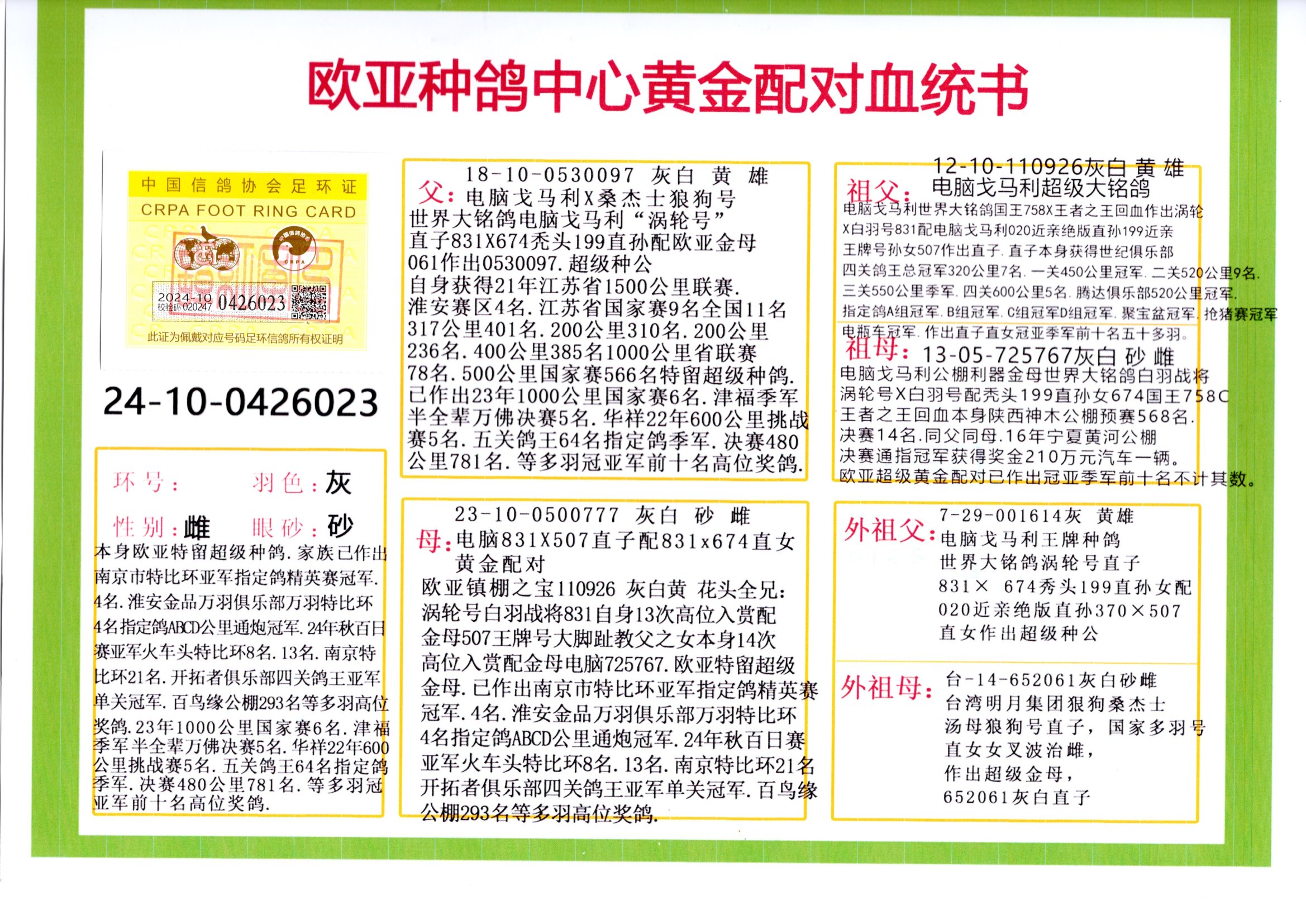 24年秋南京特比环欧亚荣获大团体冠军.小团体冠军551公里大特比13名.14名.16名.19名.20名.21名.24名.26名.27名.28名.42名.52名.54名.57名.65名.66名.68名.70名.71名.72名.74名.76名.80名.82名.83名.84名.85名.86名.90名.92名.110名.116名.121名.122名.128名.131名.158名.161名.164名.165名.166名.172名.174名.177名.182名.195名.196名.201名.205名.208名.210名.216名.253名.269名.275名.276名.294名.296名.299名,,24年秋云南天南铜都公棚决赛415名.天南铜都小棚决赛409名.云南玉活公棚决赛102名.490名.团体32名上笼二羽进二羽,天南铜都大棚506公里决赛445名。热烈祝贺河北省巨鹿县李兰生老师用欧亚泰山号血系连续十一年夺冠军,河北省国家赛冠军.全国季军等多次前十名高位,扬州王军王总用欧亚利奥24年春季获山东翔宇公棚决赛33名盖比53名。南京刘正龙刘总用欧亚盖比获得24年秋山东潍坊国际公棚决赛42名.精英赛30名.三关鸽王71名.决赛86名.加站赛16名.南京市特比环A组鸽王9名.B组鸽王5名.6名.C组鸽王5名.精英赛冠军4名.技能赛A组冠军4名.5名.秦淮区特比环荣获15名.46名.48名.87名。四川西昌徐亮徐总用欧亚利奥获得凉山州聚友决赛177名.第二关亚军双关鸽王19名.三关鸽王105名.云南豪庭公棚决赛603名。热烈祝贺24年四川重庆翔园鸽舍用欧亚泰山号荣获春季400公里冠军.秋季500公里冠军,河北王总用詹森X利奥获得千羽千翔公棚400公里冠军,广东蔡楷焕荣获24年秋爱好者 赛鸽俱乐部三关鸽王季军.一关420公里99名.二关450公里11名.三关520公里32名.单关季军.7名.12名,江西李卫兴荣获贵州红枫公棚8名.共翔俱乐部寄养棚四关综合鸽王30名.一关400公里78名.二关500公里55名.三关520公里37名.四关500公里57名.同父母获公棚18名.雷鸣获得武汉黄浦育翔中心冠军,四川陈文获得四川明鸿俱乐部300公里梦幻2名.3名.4名.9名.10名.13名.14名.15名.31名.34名.40名.41名.42名.43名.69名.71名.72名.73名.74名.94名.95名.97名.98名.99名.419公里决赛荣获总冠军7名.总共归巢9羽,四川徐亮获豪庭决赛603名,山西郑勇获得山西泰鑫公棚决赛255名詹森红狐,热烈祝贺马总获得开尔(飞跃队)决赛9名获奖金1310000万元.第一关52名,天津津福资赛180公里96名.获奖金429543万元,欧亚支持全国鸽友24年秋多人报喜 祝大家取得更好成绩,给欧亚报喜鸽友欧亚决定给每人赠送一羽超级种鸽。欧亚俱乐部特比环多关鸽王成绩:15年秋淮安特比环黑色星期一全会上笼9700多羽,当天无鸽归巢,第二天全会归巢357羽,本舍归巢158羽.前十名八羽.前一百名归巢57羽,16年春季获五关鸽王总冠军,总亚军四名.六名.七名.九名.十名.晶艺俱乐部520公里冠亚季军5名.6名.7名.9名.11名等,火车头冠军.季军6名.8名.9名.10名,16年秋晶艺俱乐部特比环520公里亚军.季军4名.6名.7名.9名,15年春南京白下特比环冠军.亚军.季军6名.7名.8名.9名.10名.指定鸽A B组获得冠军.亚军.季军4名.5名.,17年淮安特比环亚军.4名.5名.7名.8名.10名.六关鸽王总冠军.4名.6名.9名.10名,寄养棚宿迁刘总20羽特比环获冠军.季军.4名.7名.8名.9名等。18年荣获万羽特比环六关鸽王总冠军.总亚军.总季军.6名.8名.十名.单关四羽冠军.二羽亚军.四羽季军.前十名27羽。19年秋万羽特比环六关鸽王总亚军.总季军.5名.8名等,单关二羽冠军.三羽亚军.一羽季军前十名31羽。20年秋淮安市鸽会四关特比环大赛风雨无阻鸽王亚军.鸽王六名,金品俱乐部万羽特比环六关鸽王总冠军,总亚军.四名.五名.六名.七名.八名.十名.前二百名鸽王35羽,单关冠亚季军前十名四十多羽,火车头五关鸽王季军.六名.八名.前二百名鸽王十七羽。20年春荣获淮安五区一市四关鸽王总冠军.亚军.四名.八名.九名。21年秋荣获金品万羽特比环大赛六关鸽王总亚军.总季军.四名.七名.九名.十名.单关冠亚军季军前十名三十多羽。火车头协会鸽王六名.七名.十名.单关前十名十七羽。22年秋荣获鸽王总冠军.总亚军.5名.7名.8名.9名.11名.单关冠亚季军前十名三十多羽,第一关单关前二百名四十多羽,第二关前二百名三十多羽,第三关前二百名四十多羽,第四关前二百名四十多羽,第五关前一百名53羽。23年秋荣获鸽王季军.五名.八名.十名.13名.17名.20名.27名等多羽鸽王.单关前十名二十多羽。公棚.寄养棚部分成绩:16年秋宁夏黄河公棚总冠军电脑戈马力指定通炮冠军,17年送八羽参赛获得鸽王八名进奖四名,支持韩总荣获八名。支持鸽友荣获宁夏中卫公棚决赛总冠军.精英赛冠军,支持18年宁夏黄河公棚决赛冠军詹森X泰山。安徽鼎博寄养棚院内外四关鸽王总冠军.鸽王十七名.三十七名同窝,鸽王39名.42名.58名.67名。18年山东公棚预赛冠军.决赛65名.送八羽进奖五羽.指定获奔驰汽车一辆。支持鸽友获得云南蓝云公棚冠军.盖比X佛卡门。支持鸽友荣获云南银集公棚决赛冠军 詹森427X520血系 速度赛6700羽冠军。17年荣获金马俱乐部寄养棚四关鸽王总冠军.季军.六名.八名.第一关冠军.亚军.季军四名.七名.十一名.金牌教练奖。支持鸽友18年北京费翔公棚预赛九名电脑X桑杰士,支持鸽友荣获陕西威力公棚决赛11名.内蒙古临河寄养棚四关鸽王六名.詹森配泰山,支持河北王总用欧亚詹森427配胡本喜获20年秋开尔青年棚季军。云南东荣公棚16年预赛冠军.决赛77名.17年决赛12名.詹森红狐X泰山,17年平安公棚决赛4名 詹森427。欧亚获得21年金母寄养棚第一关四名.第二关5名.第三关5名.6名.7名.10名.三关鸽王总冠军,四关鸽王14名.十羽鸽王。支持河