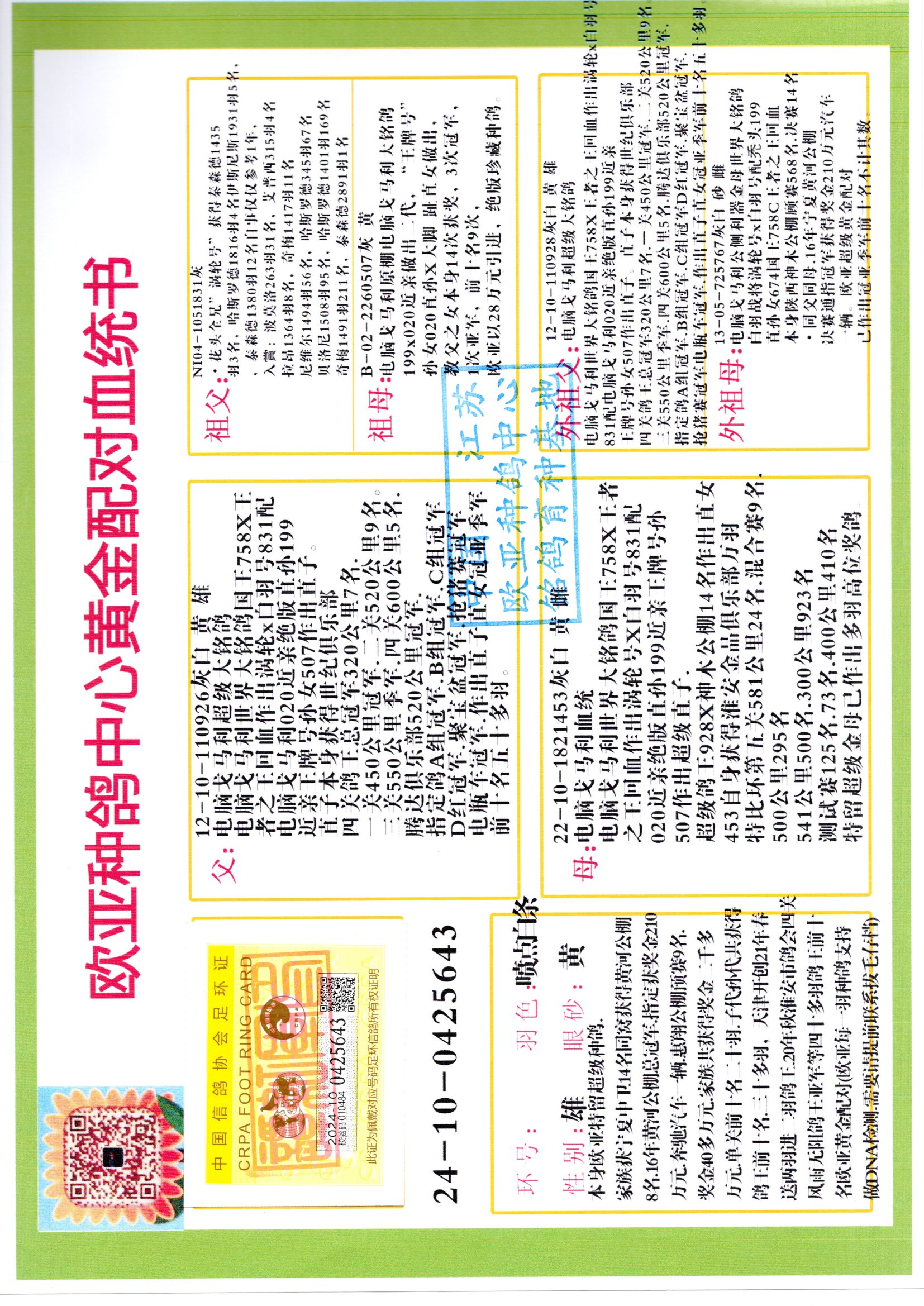 24年秋南京特比环欧亚荣获大团体冠军.小团体冠军551公里大特比13名.14名.16名.19名.20名.21名.24名.26名.27名.28名.42名.52名.54名.57名.65名.66名.68名.70名.71名.72名.74名.76名.80名.82名.83名.84名.85名.86名.90名.92名.110名.116名.121名.122名.128名.131名.158名.161名.164名.165名.166名.172名.174名.177名.182名.195名.196名.201名.205名.208名.210名.216名.253名.269名.275名.276名.294名.296名.299名,,24年秋云南天南铜都公棚决赛415名.天南铜都小棚决赛409名.云南玉活公棚决赛102名.490名.团体32名上笼二羽进二羽,天南铜都大棚506公里决赛445名。热烈祝贺河北省巨鹿县李兰生老师用欧亚泰山号血系连续十一年夺冠军,河北省国家赛冠军.全国季军等多次前十名高位,扬州王军王总用欧亚利奥24年春季获山东翔宇公棚决赛33名盖比53名。南京刘正龙刘总用欧亚盖比获得24年秋山东潍坊国际公棚决赛42名.精英赛30名.三关鸽王71名.决赛86名.加站赛16名.南京市特比环A组鸽王9名.B组鸽王5名.6名.C组鸽王5名.精英赛冠军4名.技能赛A组冠军4名.5名.秦淮区特比环荣获15名.46名.48名.87名。四川西昌徐亮徐总用欧亚利奥获得凉山州聚友决赛177名.第二关亚军双关鸽王19名.三关鸽王105名.云南豪庭公棚决赛603名。热烈祝贺24年四川重庆翔园鸽舍用欧亚泰山号荣获春季400公里冠军.秋季500公里冠军,河北王总用詹森X利奥获得千羽千翔公棚400公里冠军,广东蔡楷焕荣获24年秋爱好者 赛鸽俱乐部三关鸽王季军.一关420公里99名.二关450公里11名.三关520公里32名.单关季军.7名.12名,江西李卫兴荣获贵州红枫公棚8名.共翔俱乐部寄养棚四关综合鸽王30名.一关400公里78名.二关500公里55名.三关520公里37名.四关500公里57名.同父母获公棚18名.雷鸣获得武汉黄浦育翔中心冠军,四川陈文获得四川明鸿俱乐部300公里梦幻2名.3名.4名.9名.10名.13名.14名.15名.31名.34名.40名.41名.42名.43名.69名.71名.72名.73名.74名.94名.95名.97名.98名.99名.419公里决赛荣获总冠军7名.总共归巢9羽,四川徐亮获豪庭决赛603名,山西郑勇获得山西泰鑫公棚决赛255名詹森红狐,热烈祝贺马总获得开尔(飞跃队)决赛9名获奖金1310000万元.第一关52名,天津津福资赛180公里96名.获奖金429543万元,欧亚支持全国鸽友24年秋多人报喜 祝大家取得更好成绩,给欧亚报喜鸽友欧亚决定给每人赠送一羽超级种鸽。欧亚俱乐部特比环多关鸽王成绩:15年秋淮安特比环黑色星期一全会上笼9700多羽,当天无鸽归巢,第二天全会归巢357羽,本舍归巢158羽.前十名八羽.前一百名归巢57羽,16年春季获五关鸽王总冠军,总亚军四名.六名.七名.九名.十名.晶艺俱乐部520公里冠亚季军5名.6名.7名.9名.11名等,火车头冠军.季军6名.8名.9名.10名,16年秋晶艺俱乐部特比环520公里亚军.季军4名.6名.7名.9名,15年春南京白下特比环冠军.亚军.季军6名.7名.8名.9名.10名.指定鸽A B组获得冠军.亚军.季军4名.5名.,17年淮安特比环亚军.4名.5名.7名.8名.10名.六关鸽王总冠军.4名.6名.9名.10名,寄养棚宿迁刘总20羽特比环获冠军.季军.4名.7名.8名.9名等。18年荣获万羽特比环六关鸽王总冠军.总亚军.总季军.6名.8名.十名.单关四羽冠军.二羽亚军.四羽季军.前十名27羽。19年秋万羽特比环六关鸽王总亚军.总季军.5名.8名等,单关二羽冠军.三羽亚军.一羽季军前十名31羽。20年秋淮安市鸽会四关特比环大赛风雨无阻鸽王亚军.鸽王六名,金品俱乐部万羽特比环六关鸽王总冠军,总亚军.四名.五名.六名.七名.八名.十名.前二百名鸽王35羽,单关冠亚季军前十名四十多羽,火车头五关鸽王季军.六名.八名.前二百名鸽王十七羽。20年春荣获淮安五区一市四关鸽王总冠军.亚军.四名.八名.九名。21年秋荣获金品万羽特比环大赛六关鸽王总亚军.总季军.四名.七名.九名.十名.单关冠亚军季军前十名三十多羽。火车头协会鸽王六名.七名.十名.单关前十名十七羽。22年秋荣获鸽王总冠军.总亚军.5名.7名.8名.9名.11名.单关冠亚季军前十名三十多羽,第一关单关前二百名四十多羽,第二关前二百名三十多羽,第三关前二百名四十多羽,第四关前二百名四十多羽,第五关前一百名53羽。23年秋荣获鸽王季军.五名.八名.十名.13名.17名.20名.27名等多羽鸽王.单关前十名二十多羽。公棚.寄养棚部分成绩:16年秋宁夏黄河公棚总冠军电脑戈马力指定通炮冠军,17年送八羽参赛获得鸽王八名进奖四名,支持韩总荣获八名。支持鸽友荣获宁夏中卫公棚决赛总冠军.精英赛冠军,支持18年宁夏黄河公棚决赛冠军詹森X泰山。安徽鼎博寄养棚院内外四关鸽王总冠军.鸽王十七名.三十七名同窝,鸽王39名.42名.58名.67名。18年山东公棚预赛冠军.决赛65名.送八羽进奖五羽.指定获奔驰汽车一辆。支持鸽友获得云南蓝云公棚冠军.盖比X佛卡门。支持鸽友荣获云南银集公棚决赛冠军 詹森427X520血系 速度赛6700羽冠军。17年荣获金马俱乐部寄养棚四关鸽王总冠军.季军.六名.八名.第一关冠军.亚军.季军四名.七名.十一名.金牌教练奖。支持鸽友18年北京费翔公棚预赛九名电脑X桑杰士,支持鸽友荣获陕西威力公棚决赛11名.内蒙古临河寄养棚四关鸽王六名.詹森配泰山,支持河北王总用欧亚詹森427配胡本喜获20年秋开尔青年棚季军。云南东荣公棚16年预赛冠军.决赛77名.17年决赛12名.詹森红狐X泰山,17年平安公棚决赛4名 詹森427。欧亚获得21年金母寄养棚第一关四名.第二关5名.第三关5名.6名.7名.10名.三关鸽王总冠军,四关鸽王14名.十羽鸽王。支持河