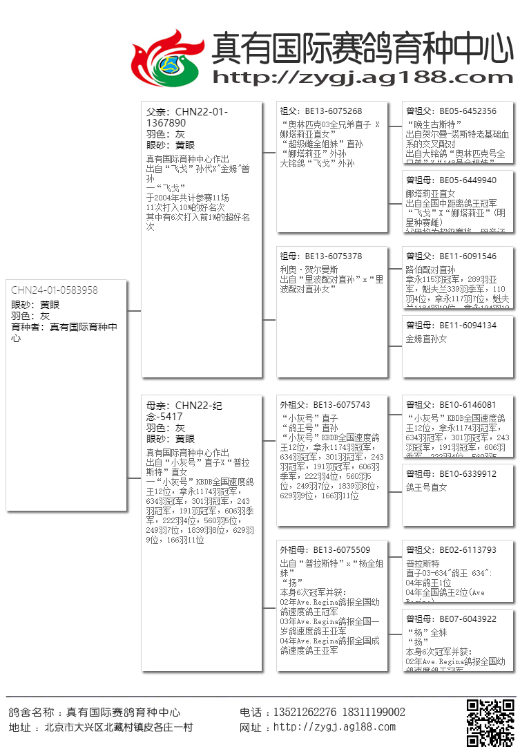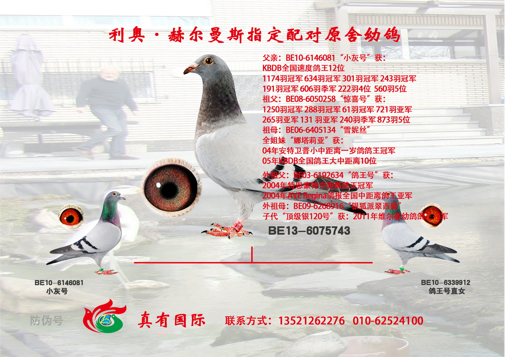 【在这三座金矿还未被世人发现之前,真有国际就第一时间把高品质的鸽子带到了国内,取得了空前的发挥。近几年大家才逐渐认识这几位大师鸽子的魅力。请记住!当任何商业鸽舍进入炒作后期的时候,他的鸽子质量与价值都会急剧下降,即便是詹森兄弟也难免于此。所以引进这家鸽舍最巅峰时期的鸽子,得以延续,才是真有国际成功的致胜法宝。】