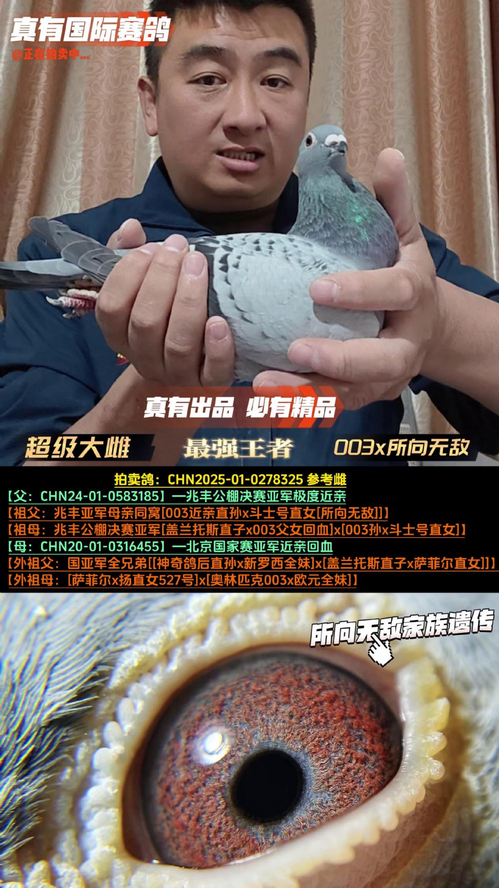 由于所有拍卖鸽均没有作育记录,因此无法100%保证雌雄的正确性,拍卖视频中的雌雄仅供参考,最终以实物为主。如有雌雄特殊要求请及时联系真有国际确认,所有拍卖鸽均享受7天免费换鸽服务(运费自理),由于拍卖形式的鸽子具备商品的唯一性,因此不支持退款服务,感谢大家的理解与支持!谢谢!