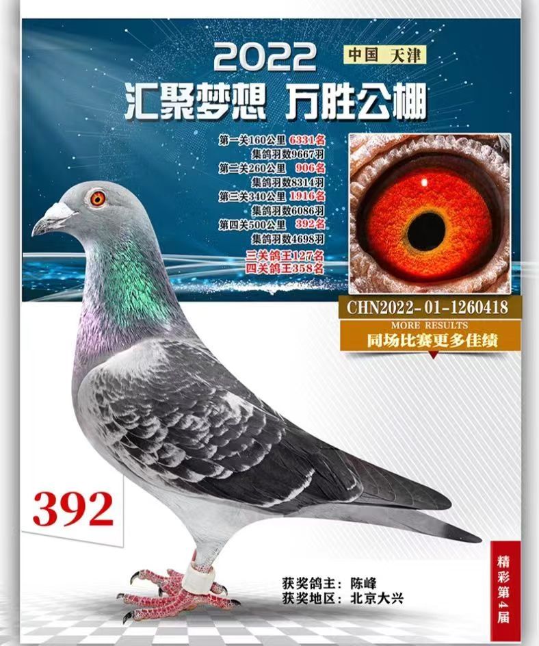 父亲为100%安德烈勃默德系,本舍主力种鸽。本身获得2022年天津万胜公棚决赛392名,作出多羽公棚获奖鸽