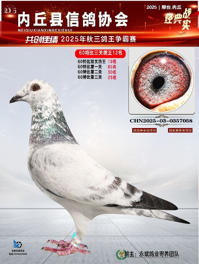 | 1615844 | 60特比三关鸽王亚军 精英赛冠军 | ¥400元 | 3次 |