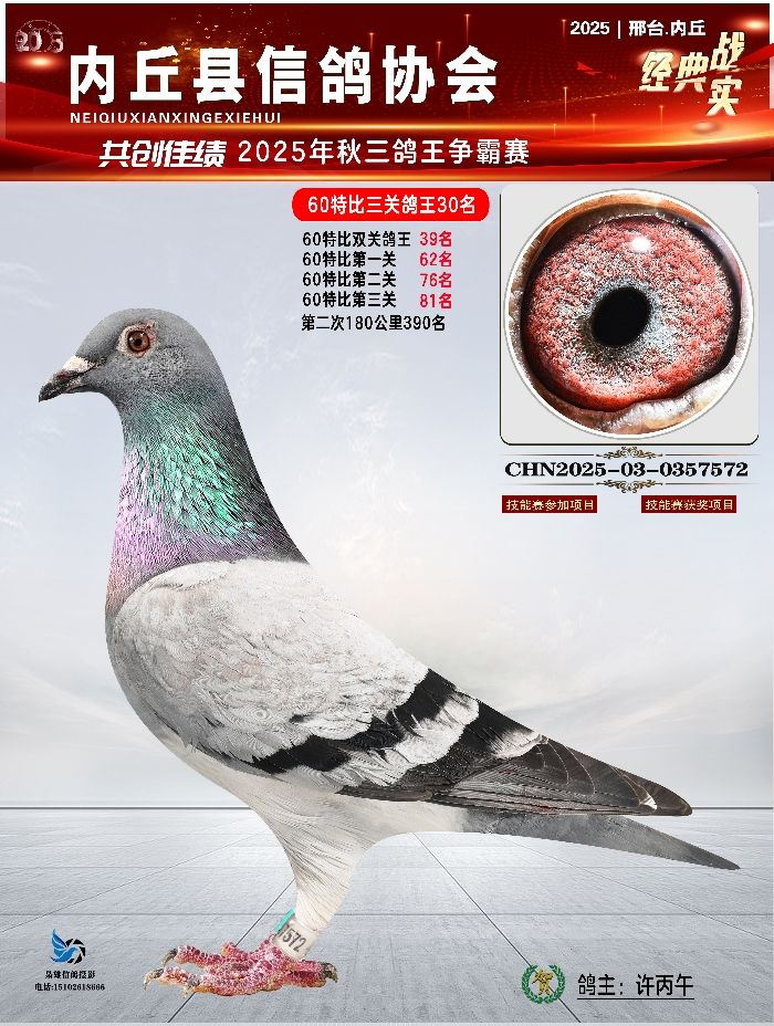 | 1615844 | 60特比三关鸽王亚军 精英赛冠军 | ¥400元 | 3次 |