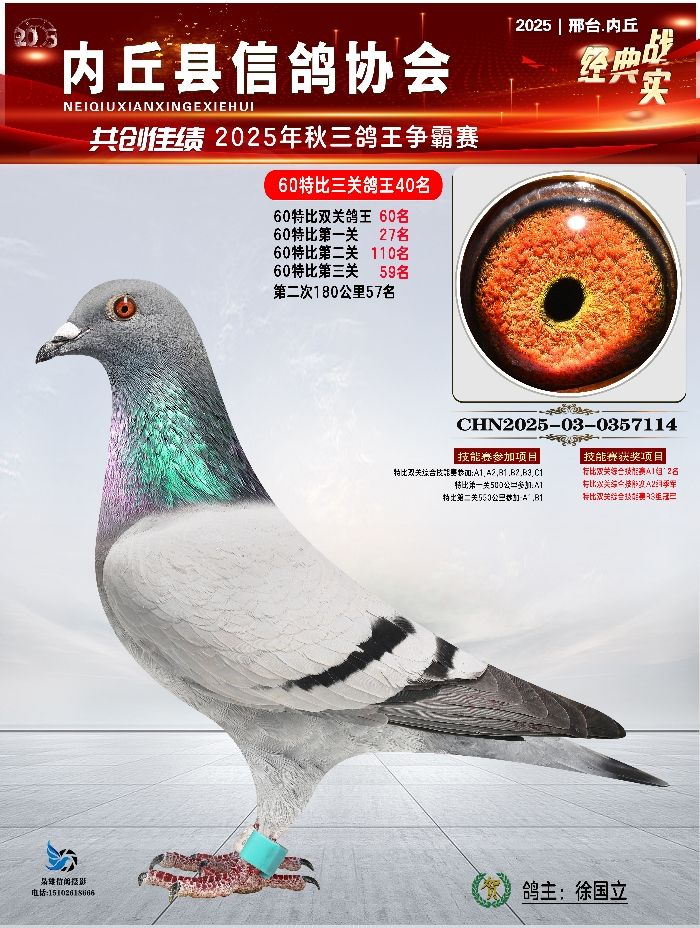 | 1615844 | 60特比三关鸽王亚军 精英赛冠军 | ¥400元 | 3次 |