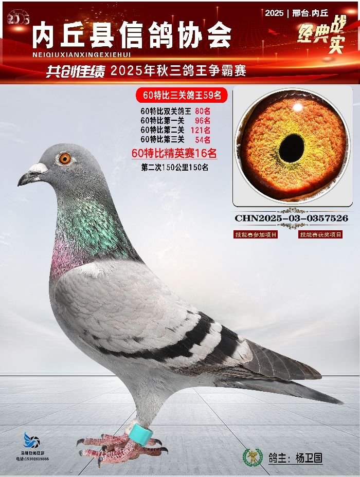 | 1615844 | 60特比三关鸽王亚军 精英赛冠军 | ¥400元 | 3次 |