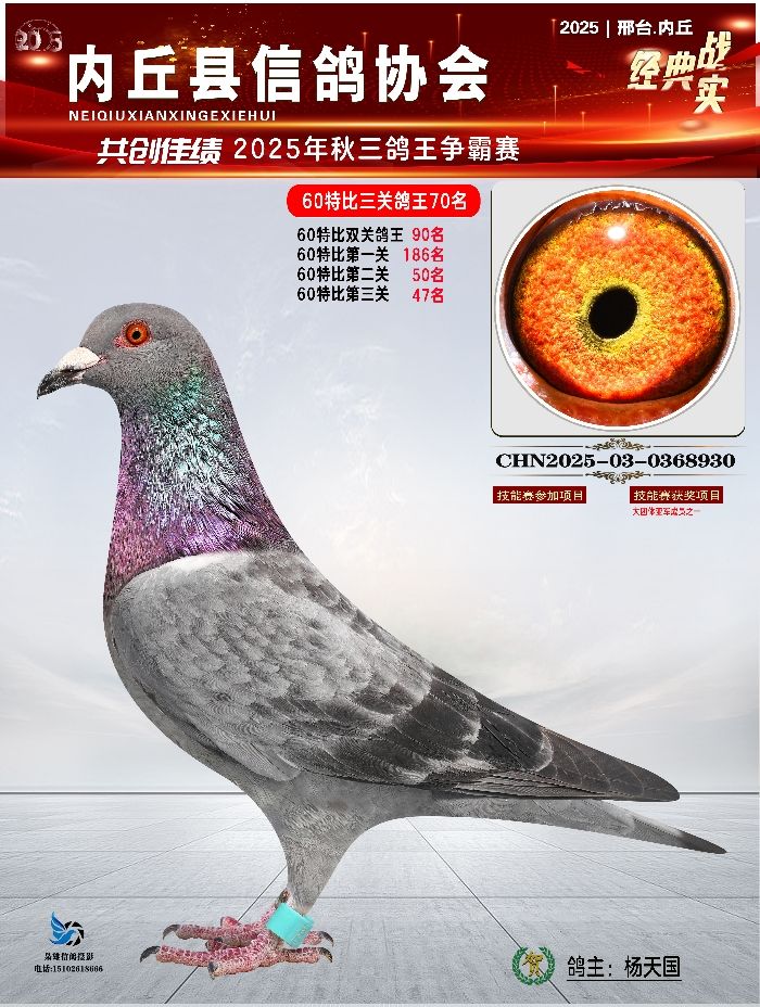 | 1615844 | 60特比三关鸽王亚军 精英赛冠军 | ¥400元 | 3次 |
