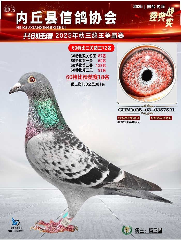 | 1615844 | 60特比三关鸽王亚军 精英赛冠军 | ¥400元 | 3次 |