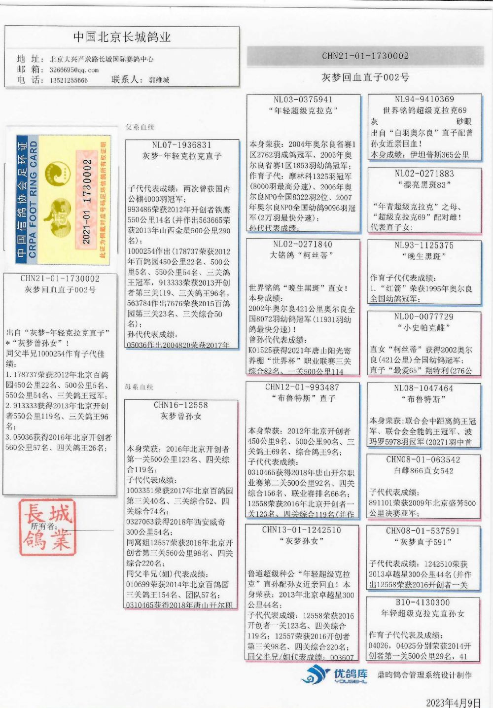 | 1617331 | 长城鸽业 新年轻克拉克-1734897 | ¥1500元 | 5次 |