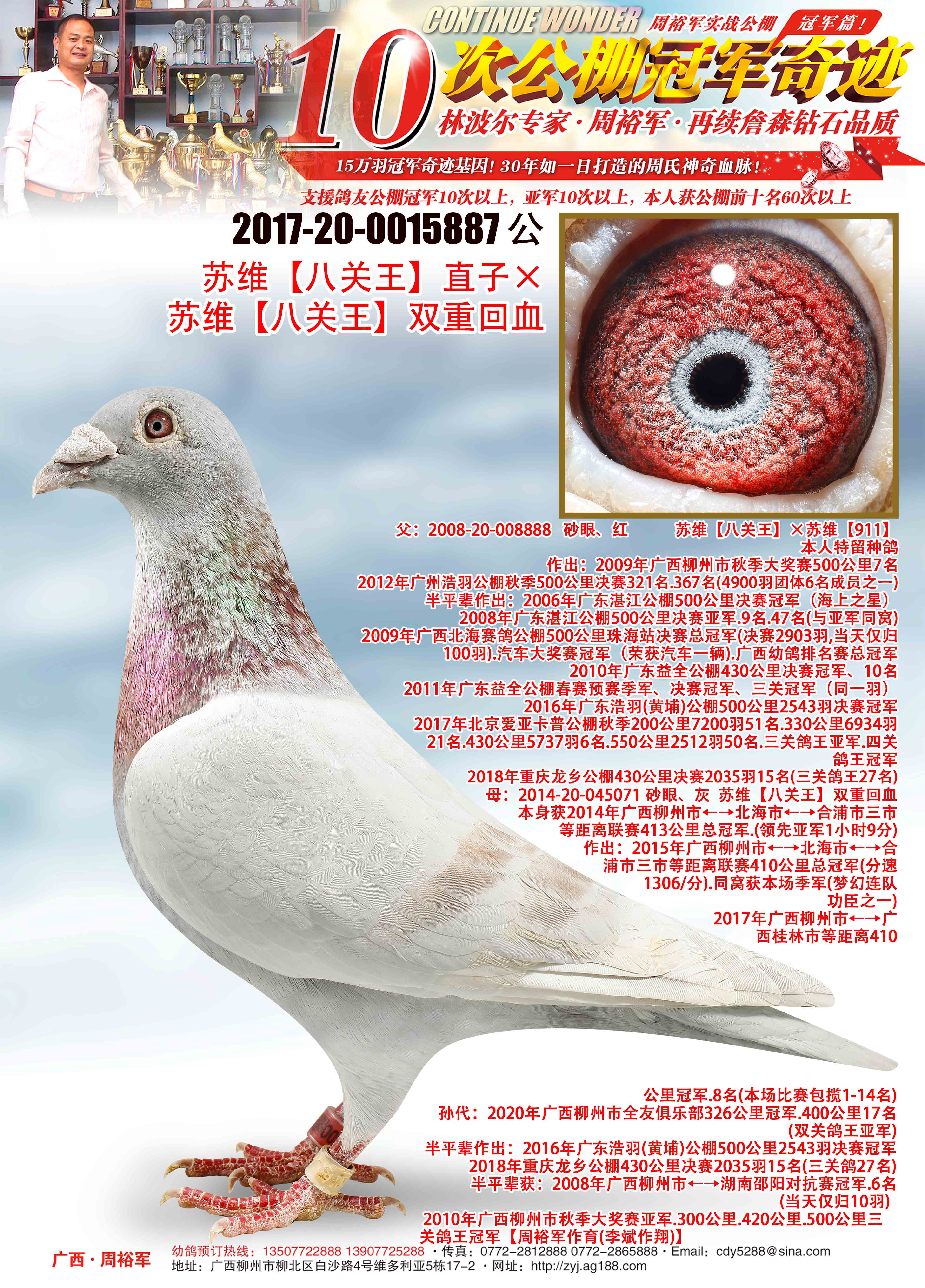 2017年北京爱亚卡普公棚秋季200公里7200羽51名、330公里6934羽21名、430公里5737羽6名、550公里2512羽50名、三关鸽王亚军、四关鸽王冠军 父:2008-20-008888 砂眼、红 苏维【八关王】×苏维【911】