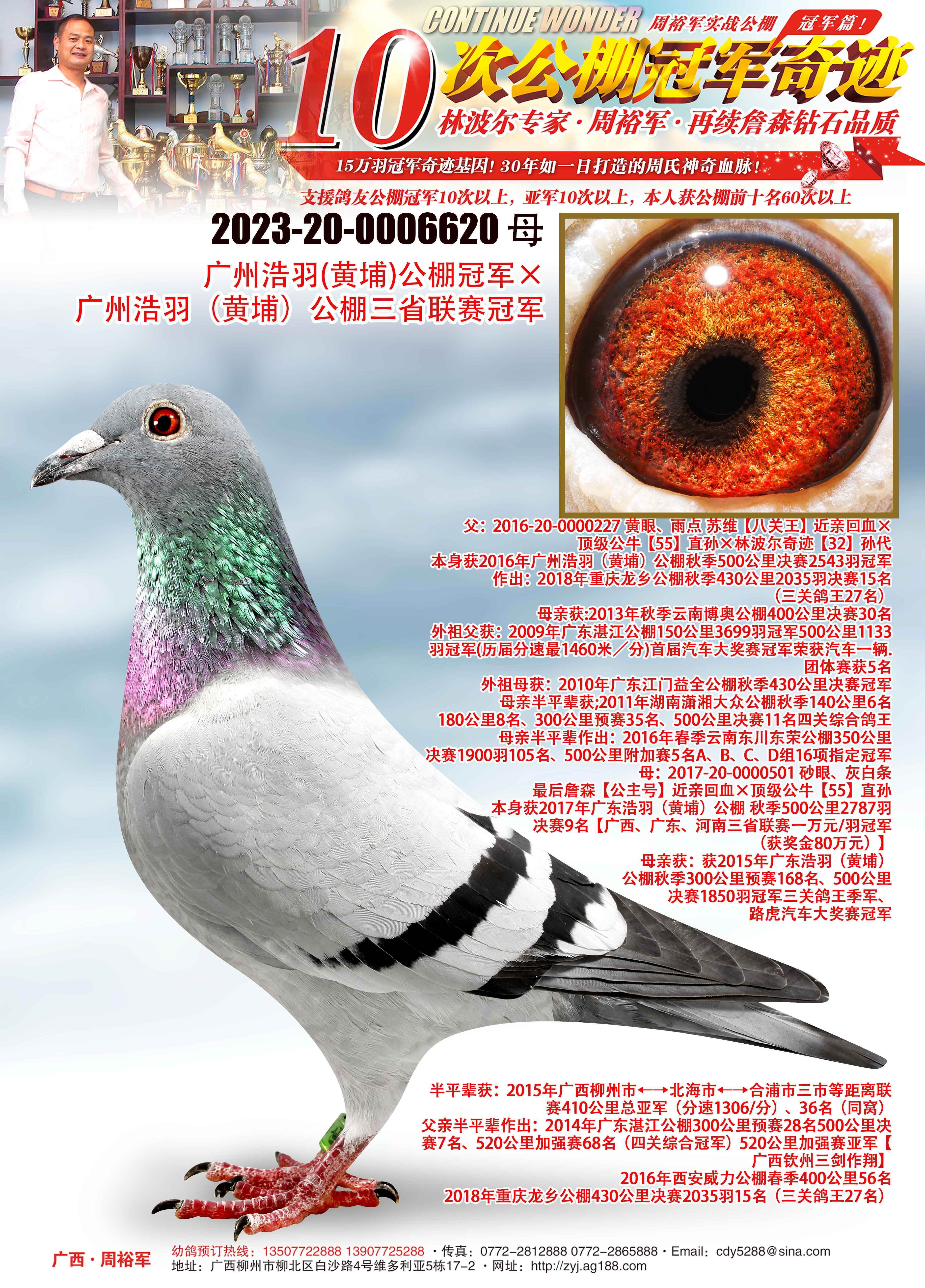 - 血统:广州浩羽(黄埔)公棚冠军×广州浩羽(黄埔)公棚三省联赛冠军