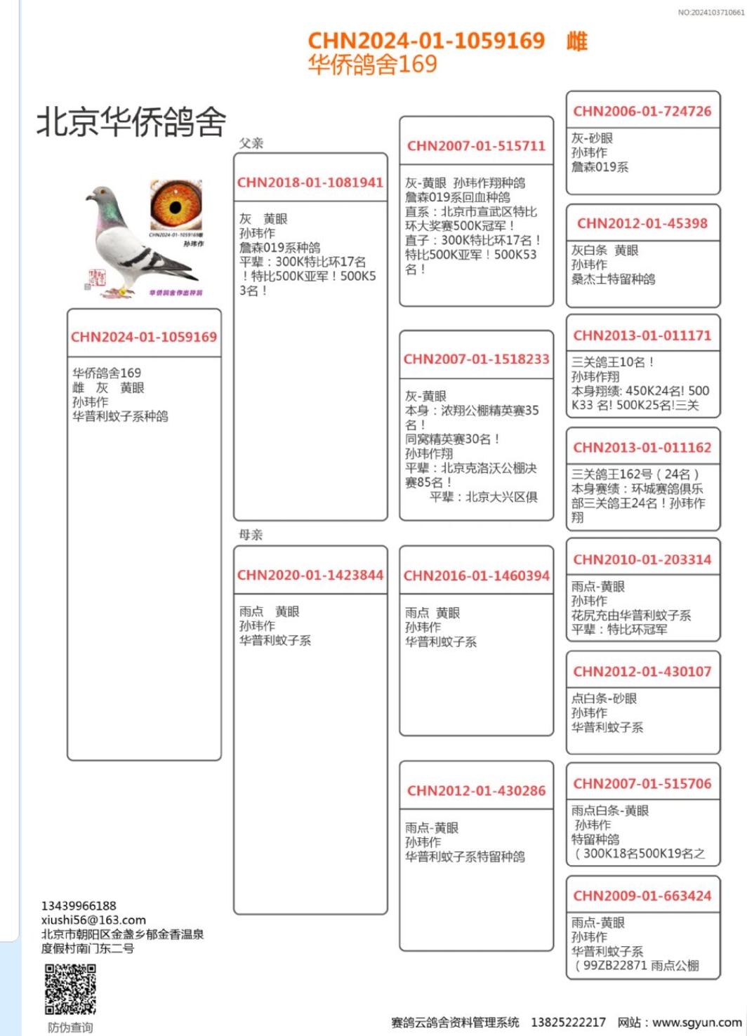 华侨鸽舍黄金配对三关鸽王10名011171号配三关鸽王24名011169号的回血种鸽用作出