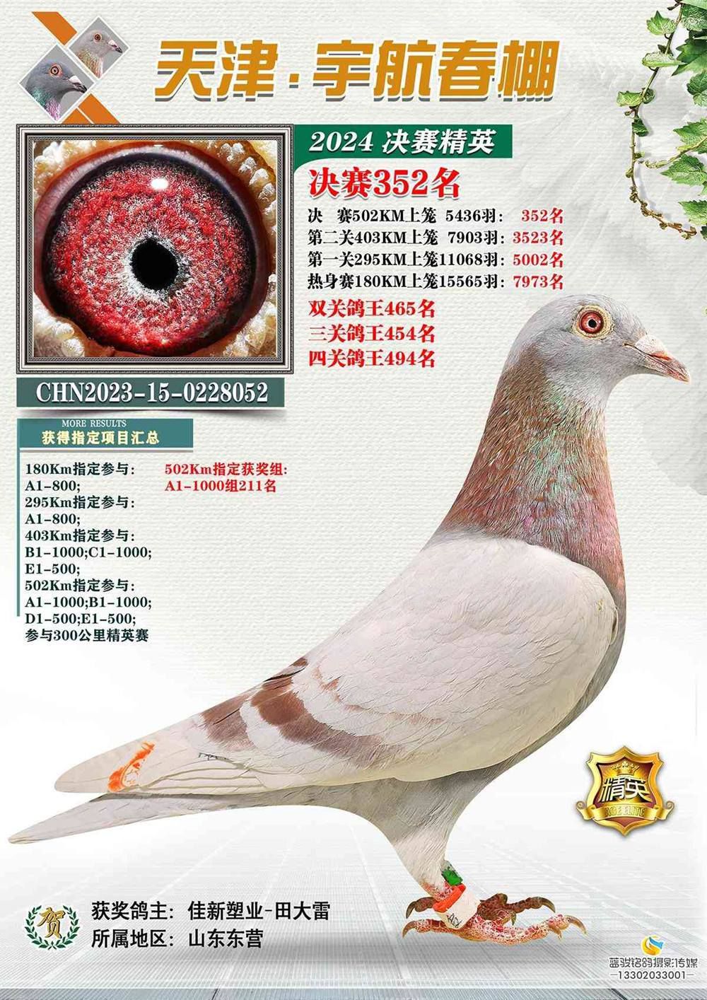 天津宇航赛鸽公棚(春棚)502公里决赛352名;