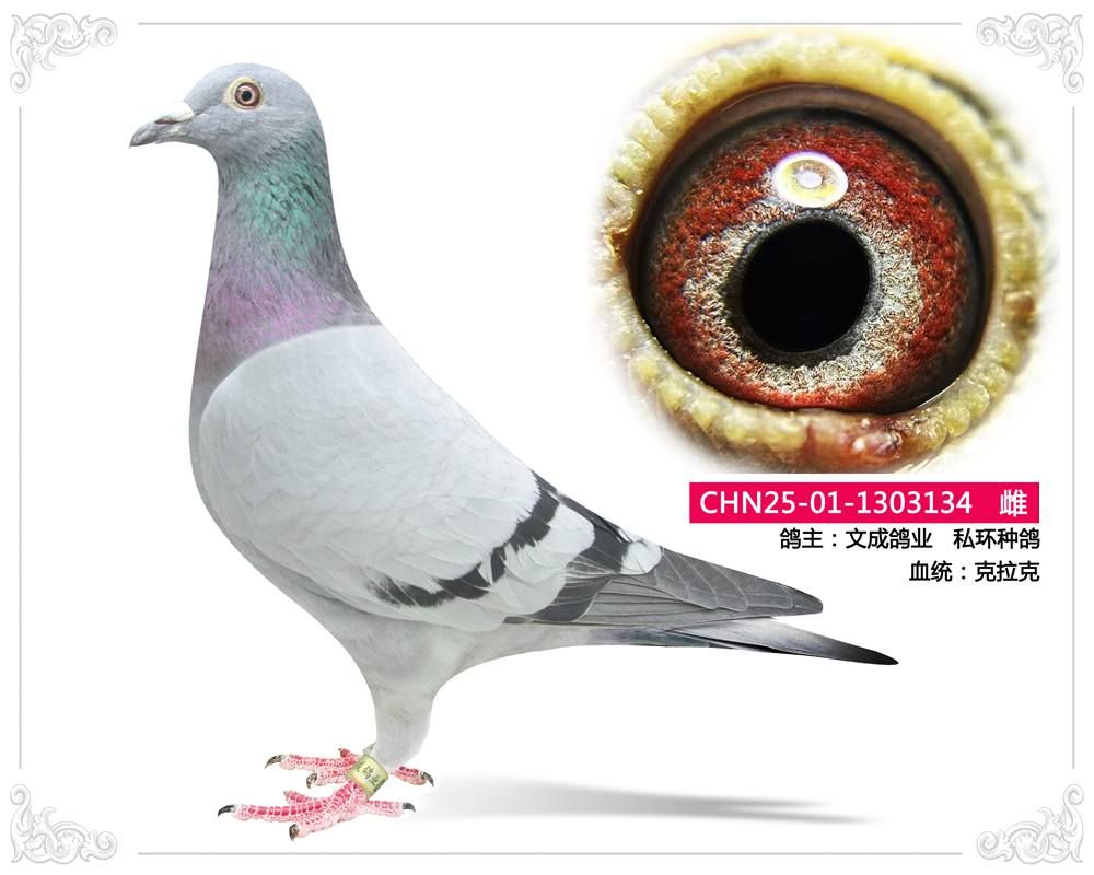 CHN25-01-1303134 雌 血统:克拉克;鸽主:文成鸽业 私环种鸽 "咨询电话: 13601192027 白宇 (微信同号)运输方式:快递60/羽【新疆西藏包括】、长途车100元【不论羽数】、飞机400元"