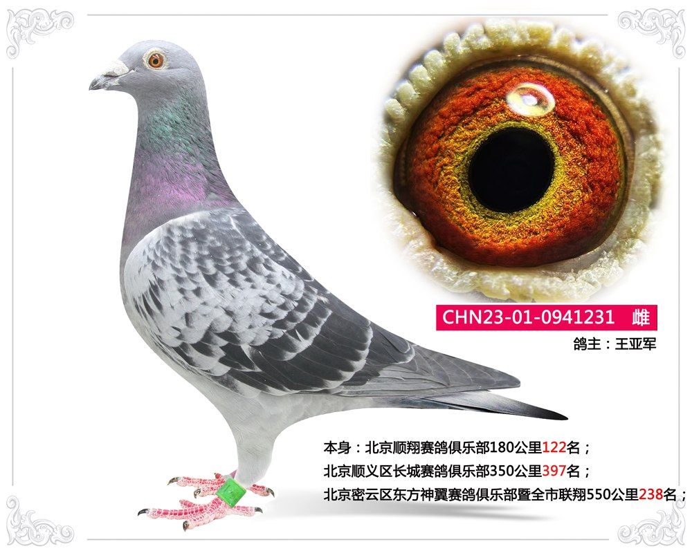 CHN23-01-0941231 雌 本身:北京顺翔赛鸽俱乐部180公里122名;北京顺义区长城赛鸽俱乐部350公里397名;北京密云区东方神翼赛鸽俱乐部暨全市联翔550公里238名;鸽主:王亚军 咨询电话: 13601192027 白宇 (微信同号)运输方式:快递60/羽【新疆西藏包括】、长途车100元【不论羽数】、飞机400元"