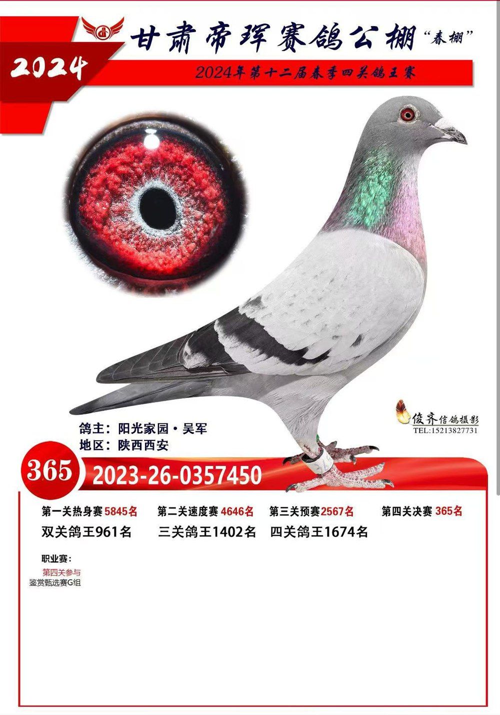 甘肃庆阳帝珲赛鸽春棚509公里决赛366名;