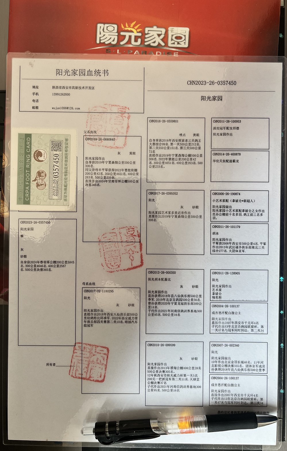 母:CHN2017-32-1180295 阳光家园作出 直接作出2018年西安八仙俱乐部500公里幼鸽特比环季军,2022年西安威力青年俱乐部四关赛第二关10名,暗插汽车组冠军;