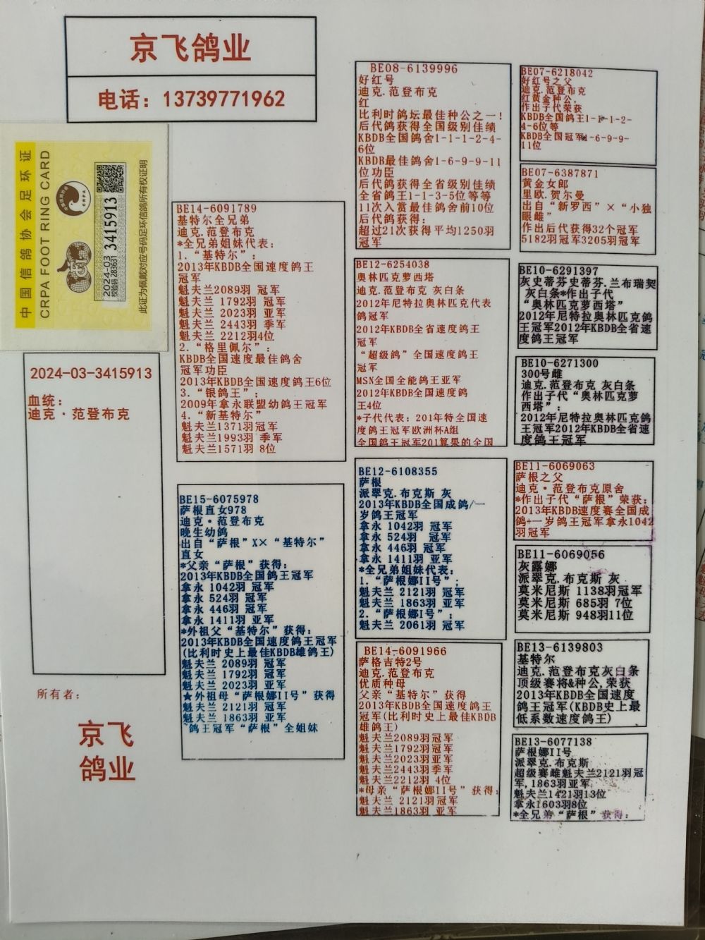 BE15-6075978萨根直女978迪克·范登布克晚生幼鸽