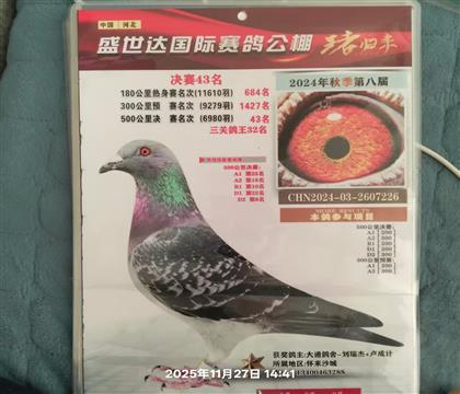 | 1618257 | 幸运鸽舍徐强做出四关鸽王187名芬尼卡500 | ¥300元 | 0次 |
